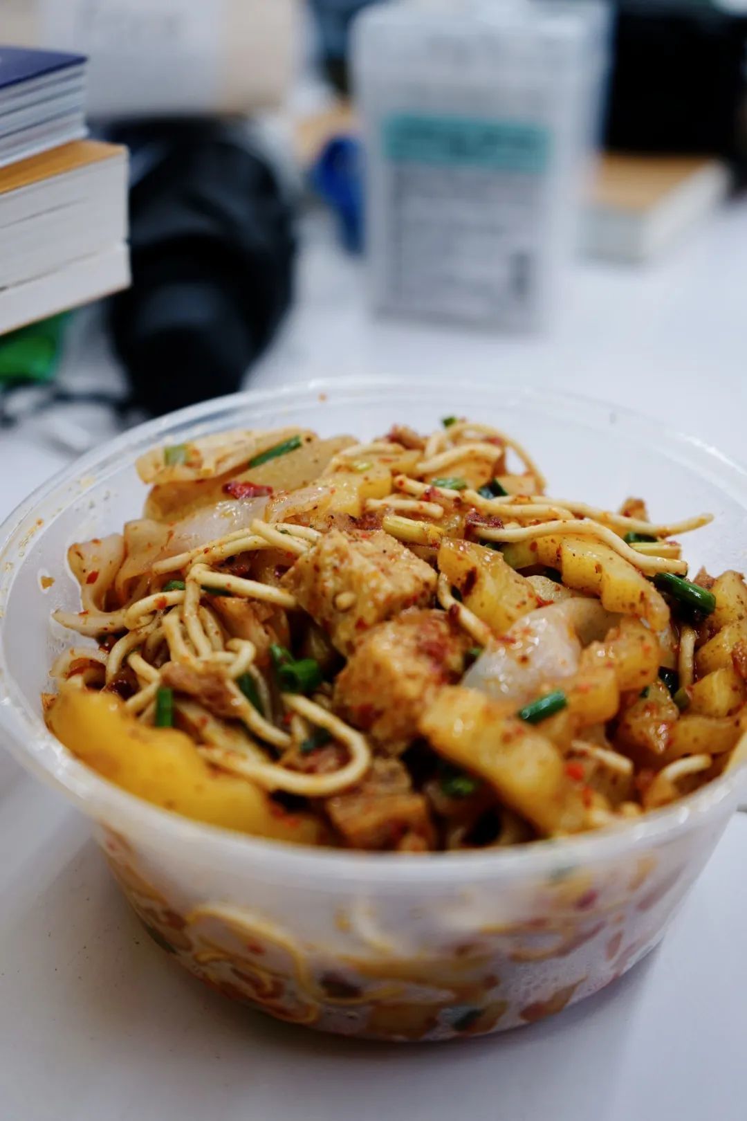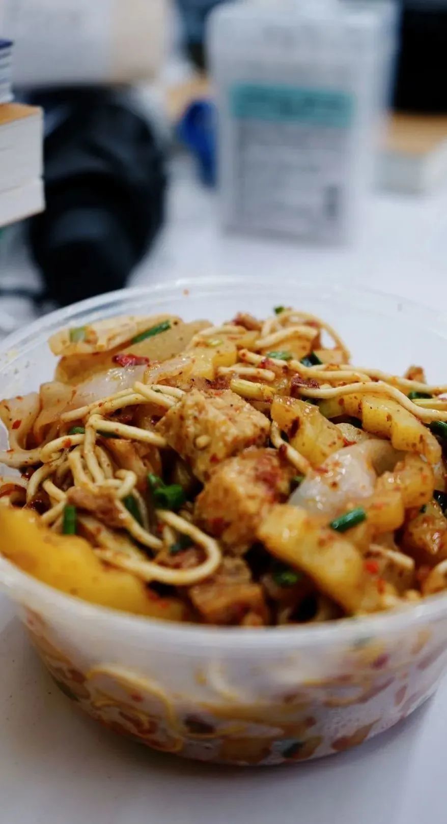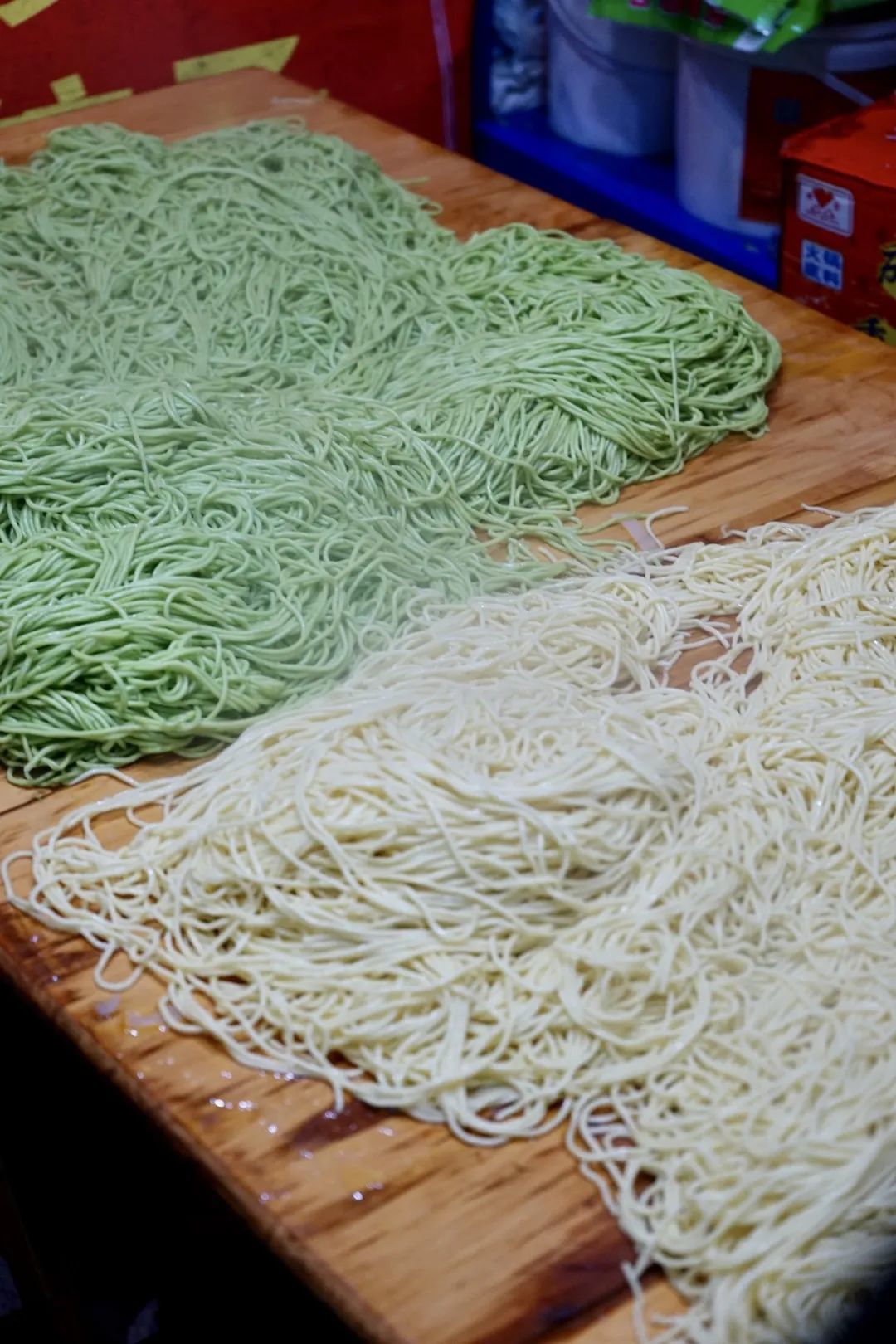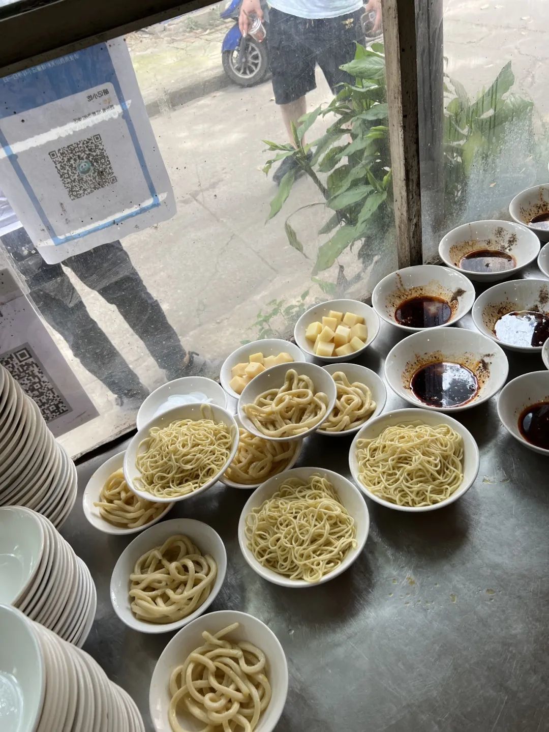 夸张到什么程度,桌子上是摆的凉面墙,背后墙角有两件凉面,一排一摞层峦叠嶂,就连三轮的车斗里都塞满了凉面。