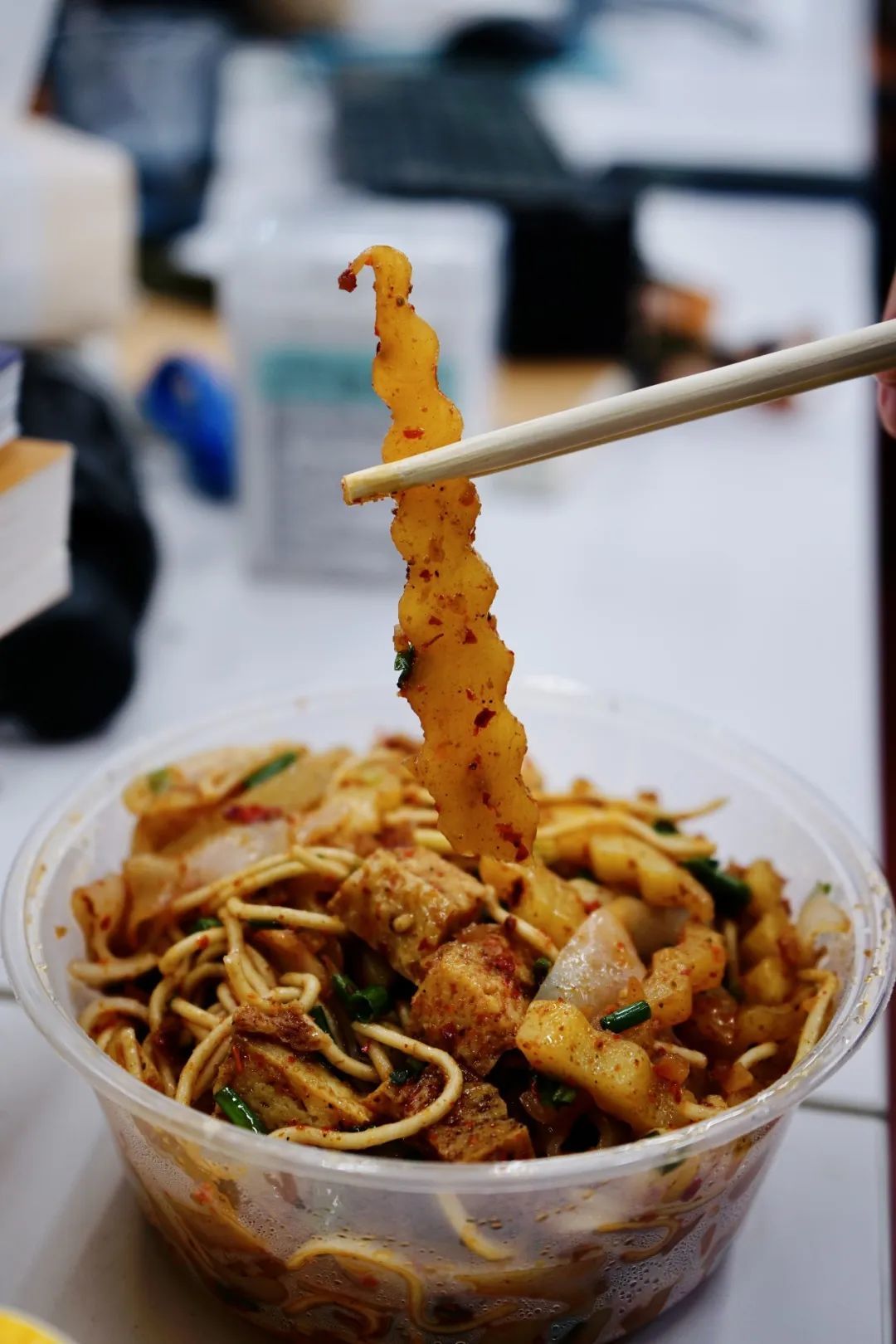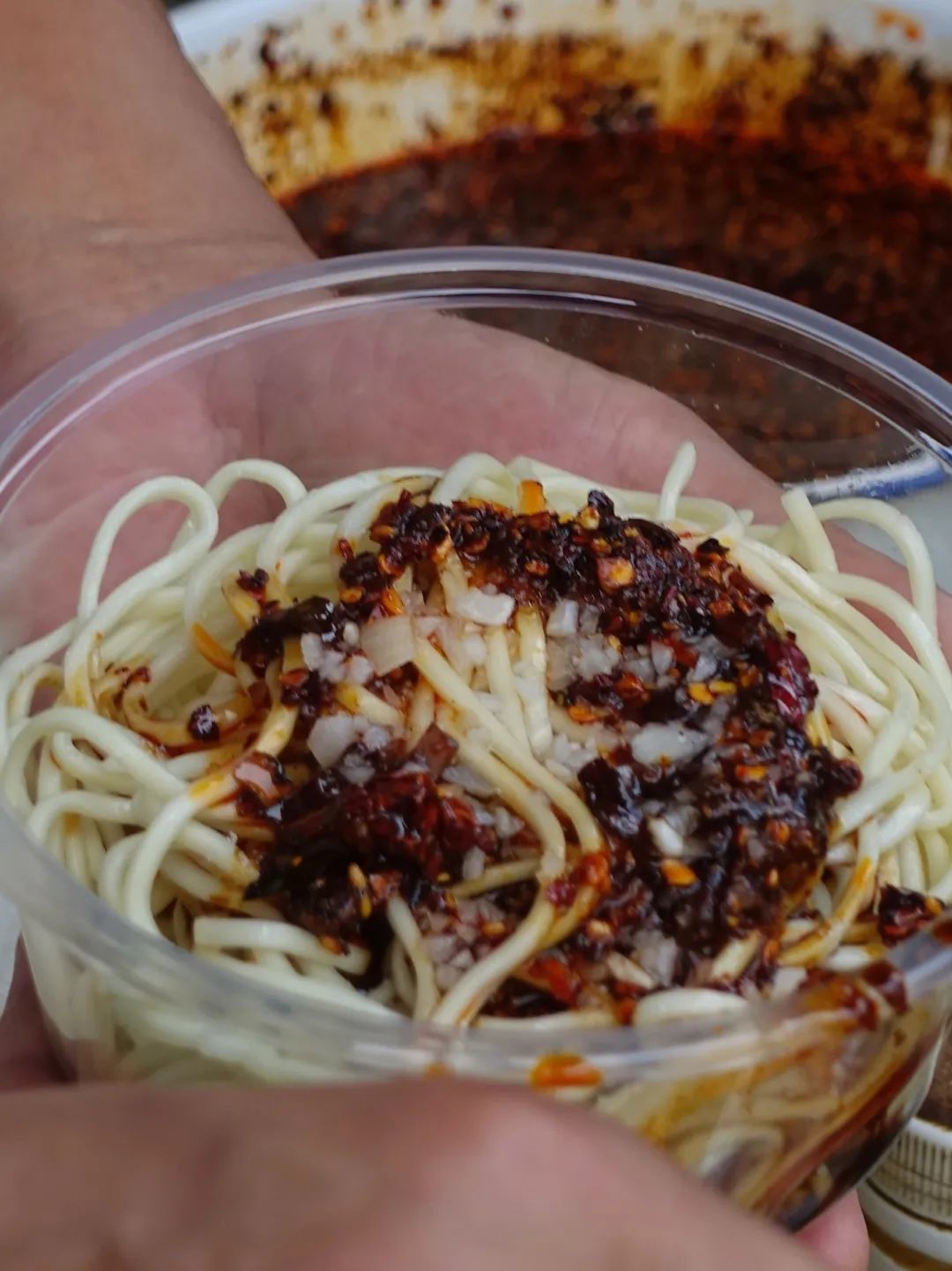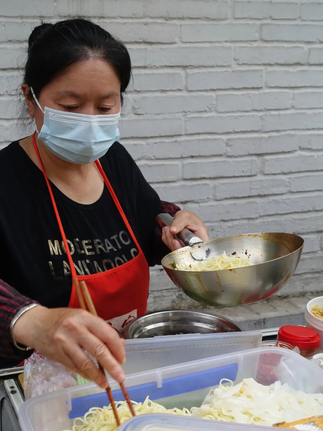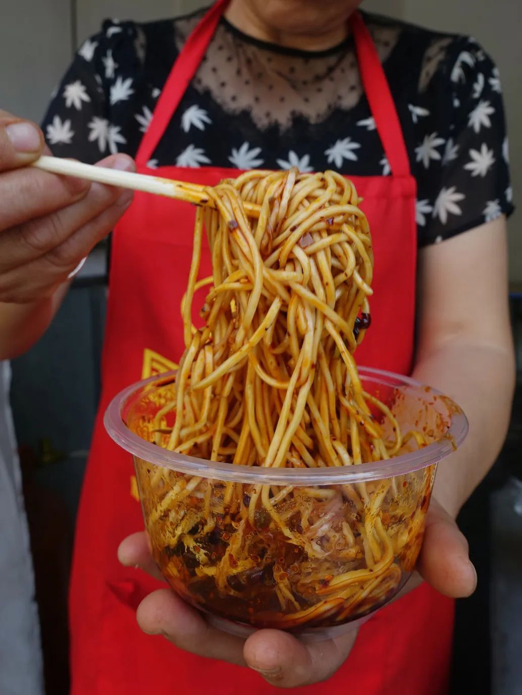 凉面装在透明的收纳盒里,马姐心里有数,一筷子就能拈起一盒的量,凉面淡黄又清爽,每一根都细长饱满泡臊柔软。
