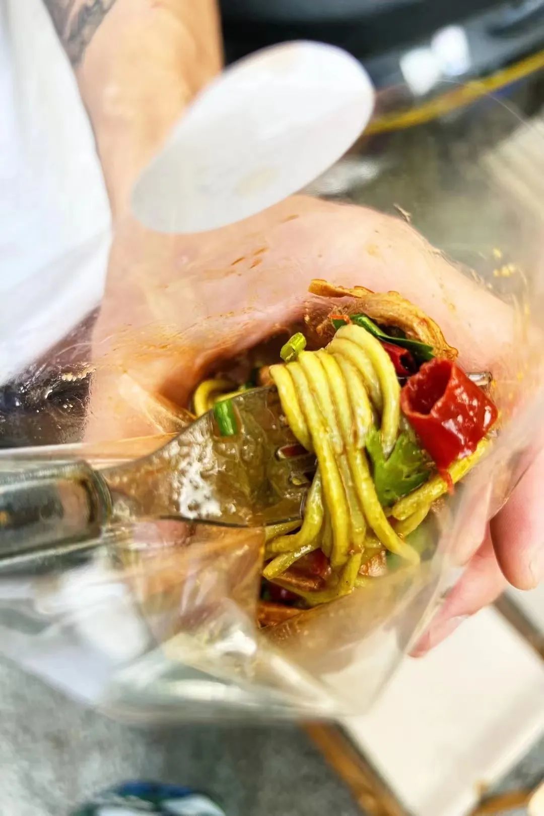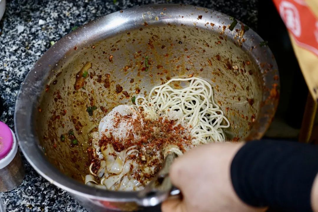 这个就少见了,按搓,挤揭,抓拿……温温柔柔,每一根凉面都像是做了一个深度SPA,调料挂满面条,入味诱人。