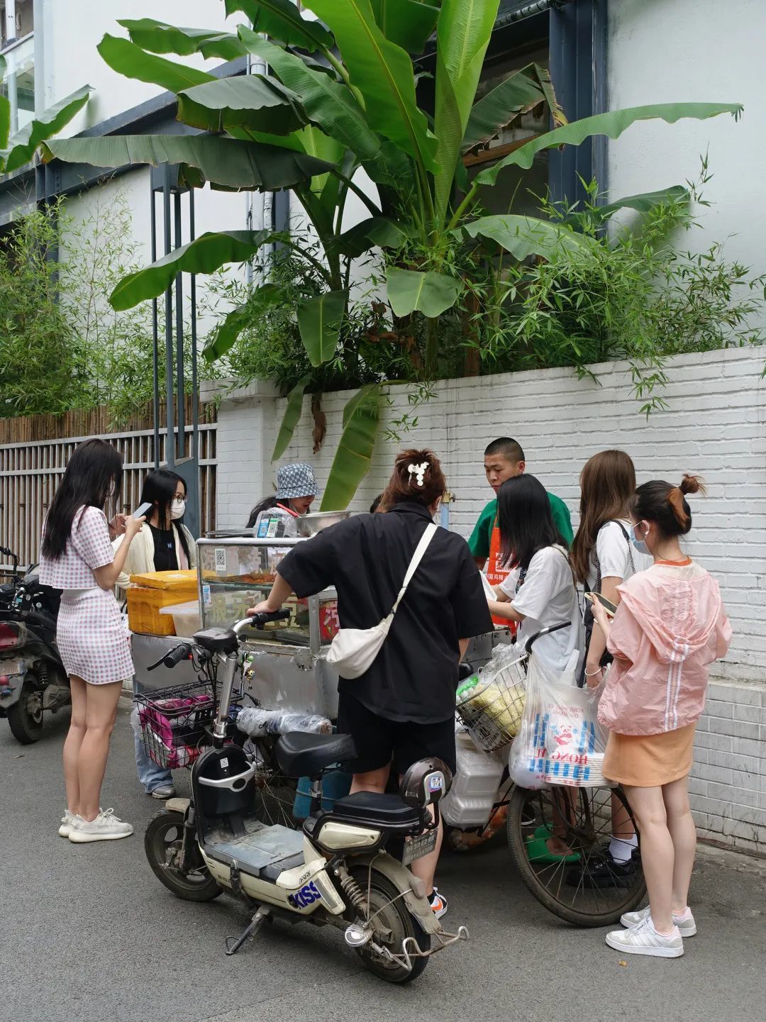 下午四点推车出摊,背靠着两棵芭蕉树乘凉,“一晚上要卖二十斤凉面”,不锈钢瓜瓢用来拌面,调料统一用塑料瓶子装起来。