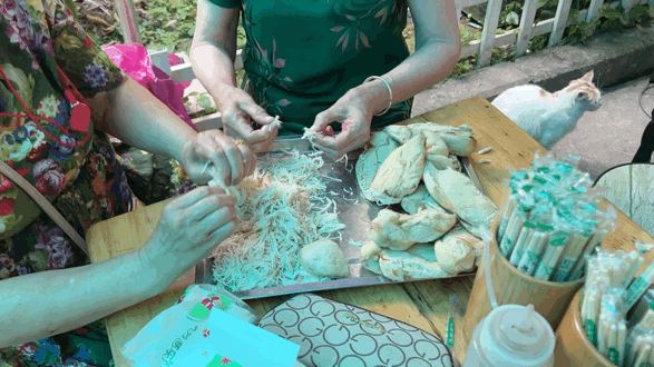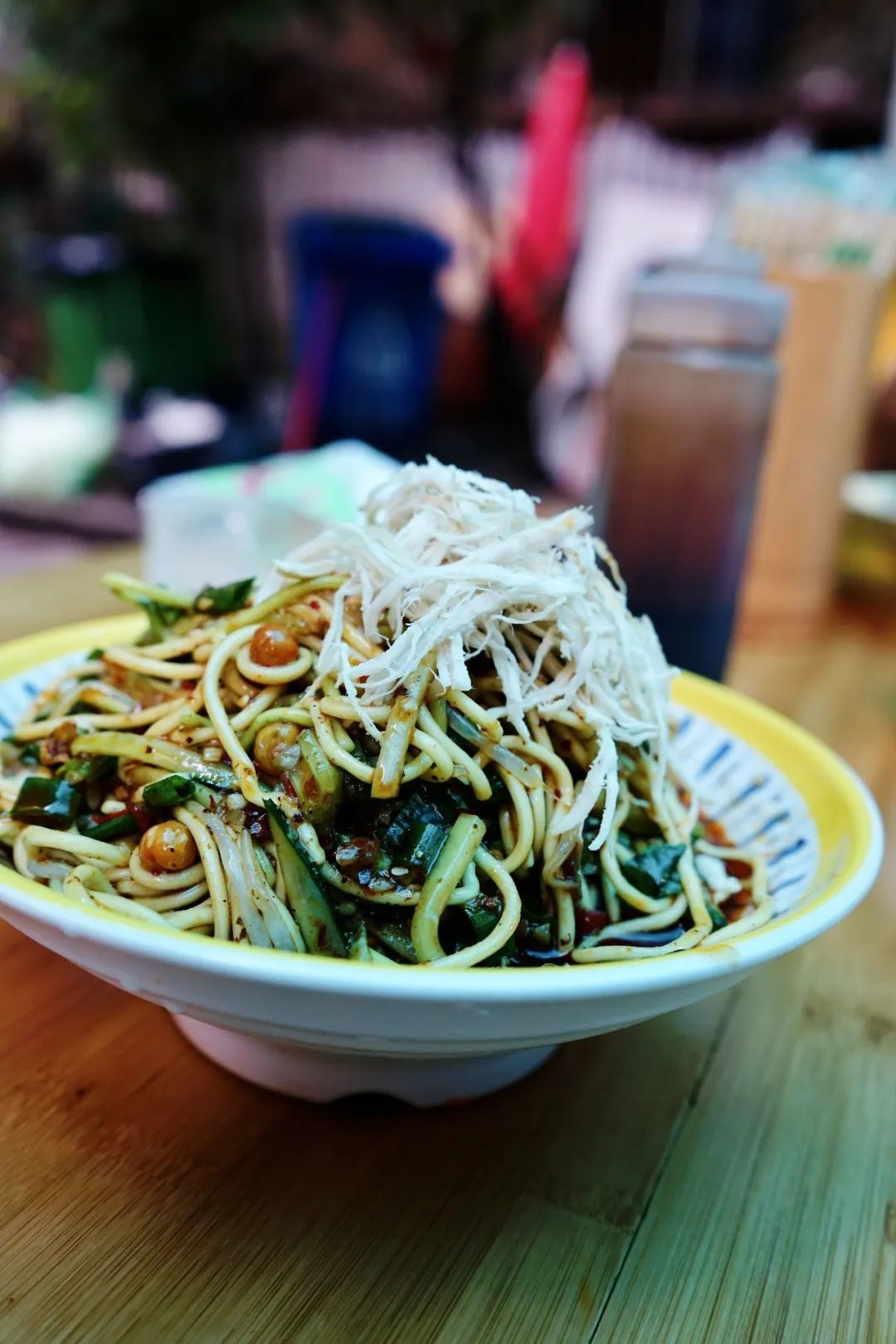 最后拈一手指的鸡丝点缀。鸡丝也是老板一家现扯。戴珍珠项链的老奶奶,坐在院坝头,一根根手撕而成。