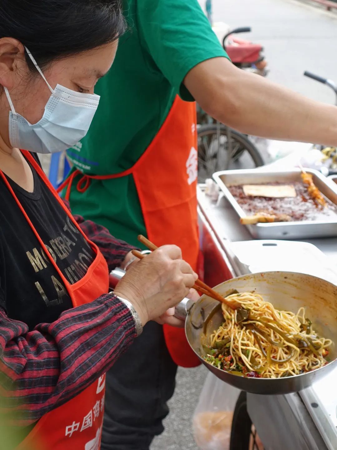 正对面又来了一对老夫妇,他们停好自己的电频三轮车跟老板说“来两个2两的甜水面。”