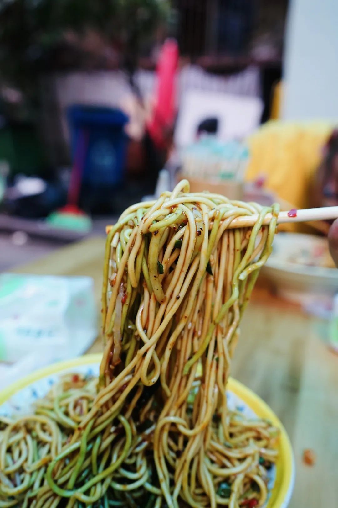 你一说你要凉面,老板儿娘就会拿出一个空碗,挑一大夹黄澄澄的面进去,用筷子一点点地把面捞得蓬松有致。