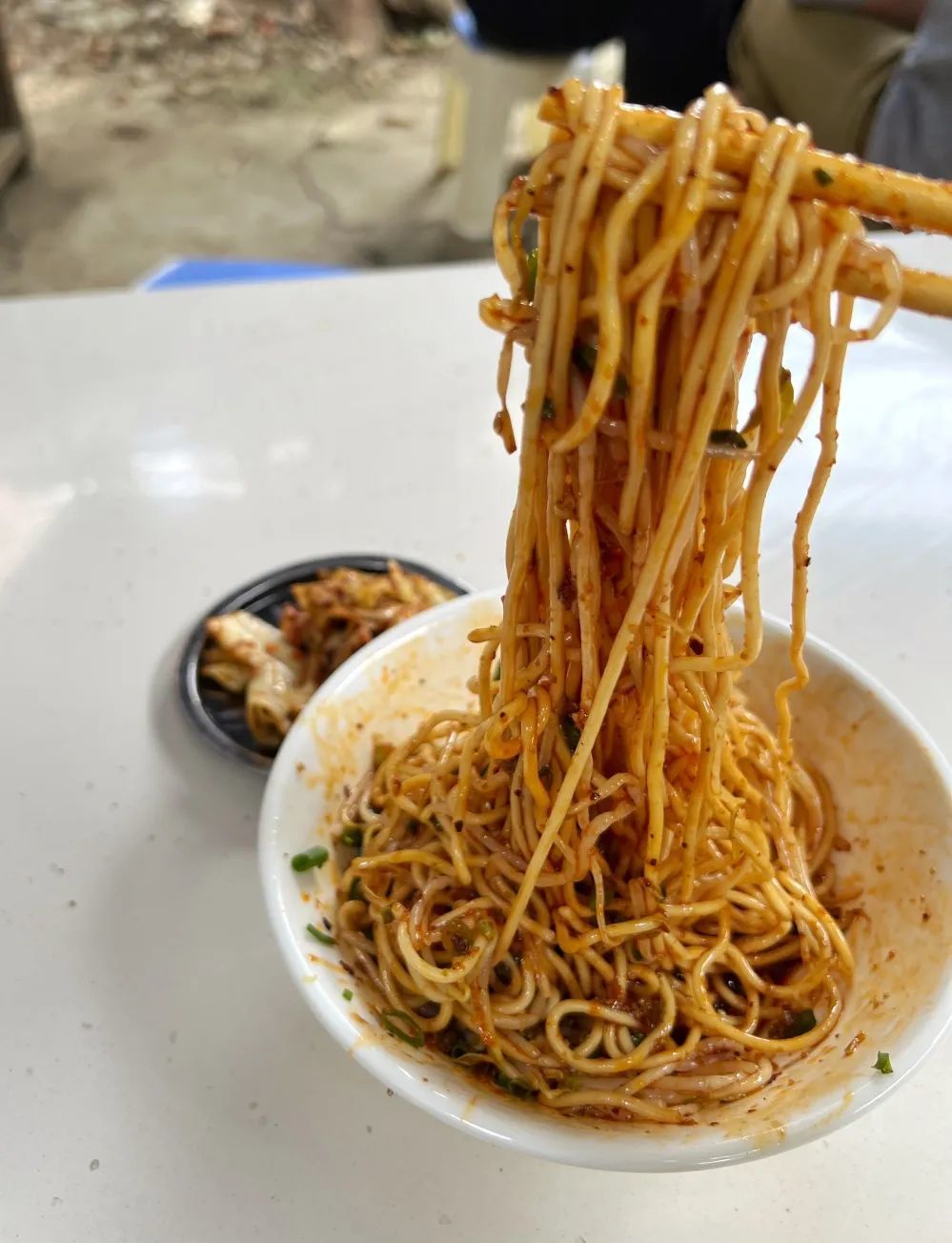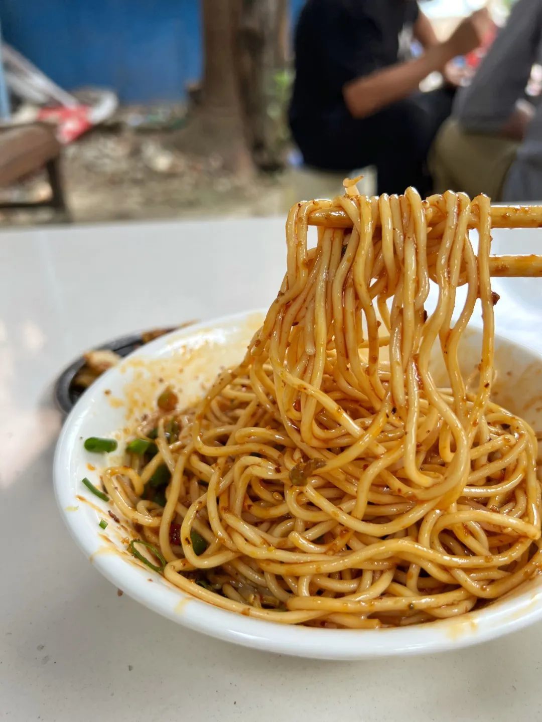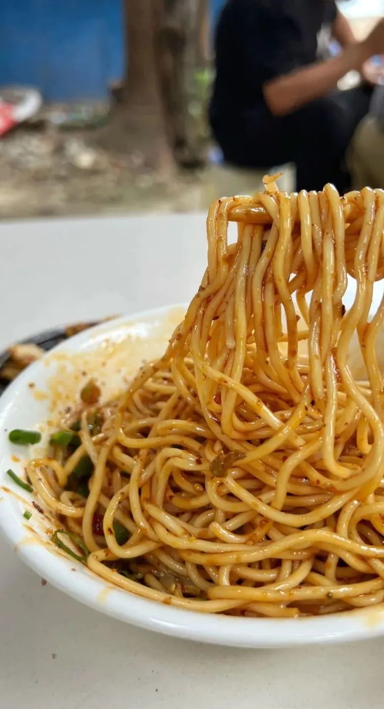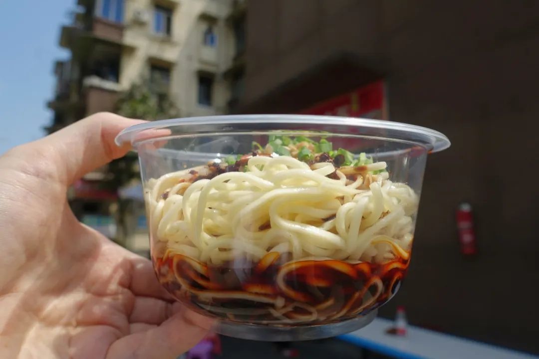 这碗面至少有2两,非常扎实,面条是细根的棍棍面,非常的顺滑,一口下去是非常突出的红油香,是最古早的凉面味,好吃,平凡又普通的好吃,只是甜味略重了一些。