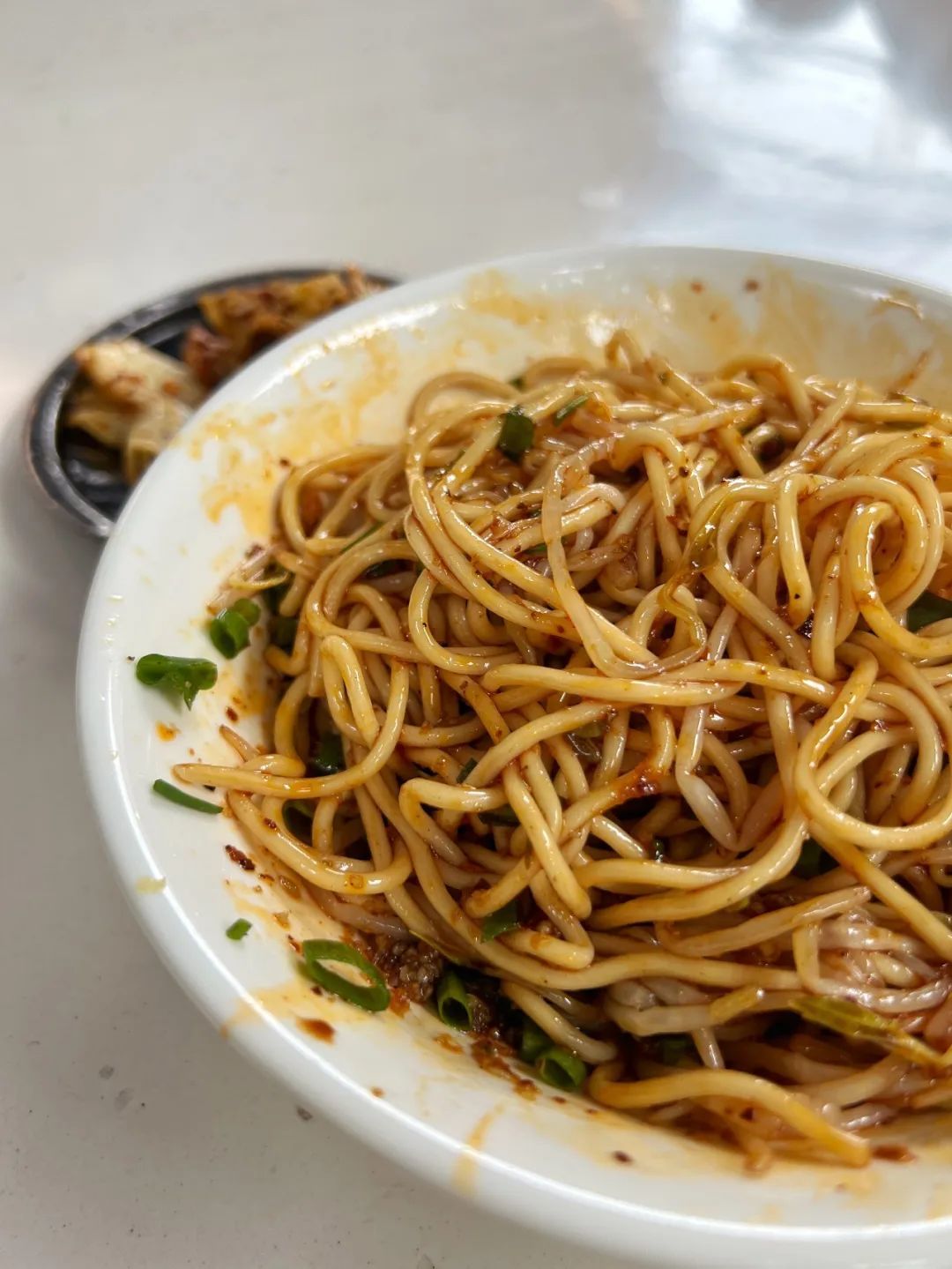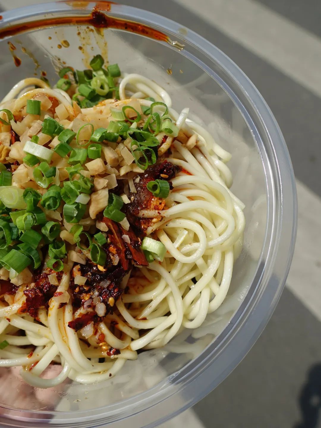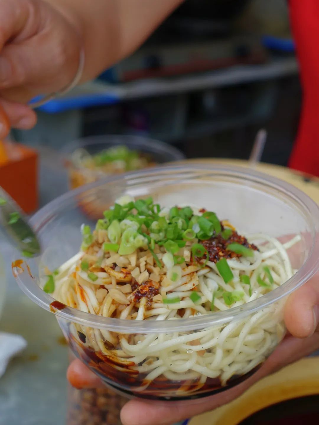 这碗面至少有2两,非常扎实,面条是细根的棍棍面,非常的顺滑,一口下去是非常突出的红油香,是最古早的凉面味,好吃,平凡又普通的好吃,只是甜味略重了一些。