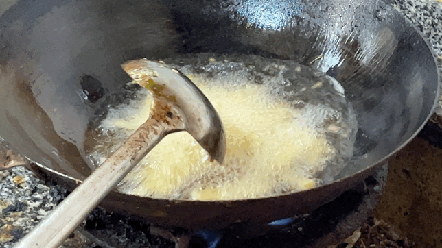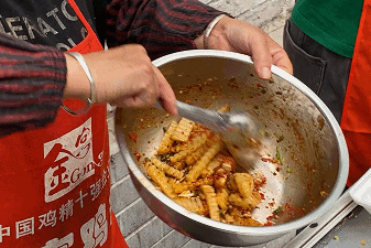 十余种调料,“呋呋呋”声中,师傅便轻快熟练地调出最畅销的糖醋麻辣味,最后以一勺旺实的熟油海椒收尾。