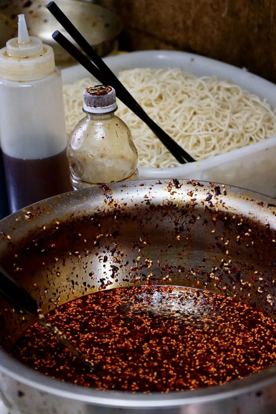 老板儿娘是个会兑佐料的人,熟油海椒也煎得好。面质细而弹韧,附着了各味调料之后,香、辣、酸三种味道扑鼻而来,正中成都人下怀。