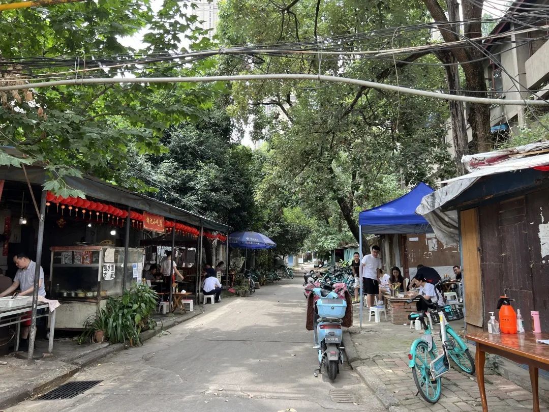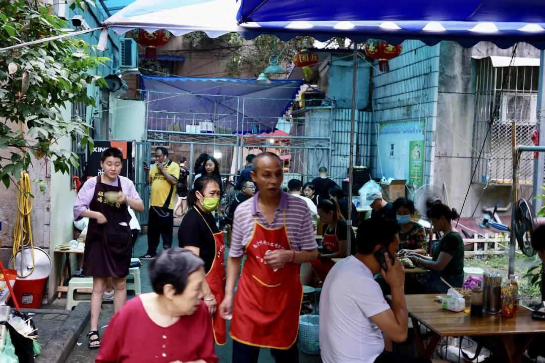 两栋没有人住的楼下,食客们已经一人霸占了一个桌子。几乎每个人面前都是2-3个碗,一碗面一碗饺子、一碗凉粉一碗面,面还没到的人均一碗面汤一碟泡菜。