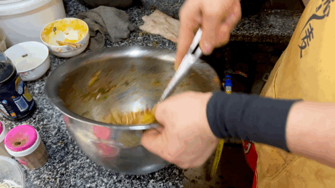 一般是女老板打调料,另一个师傅,则只负责拌。