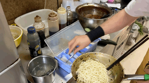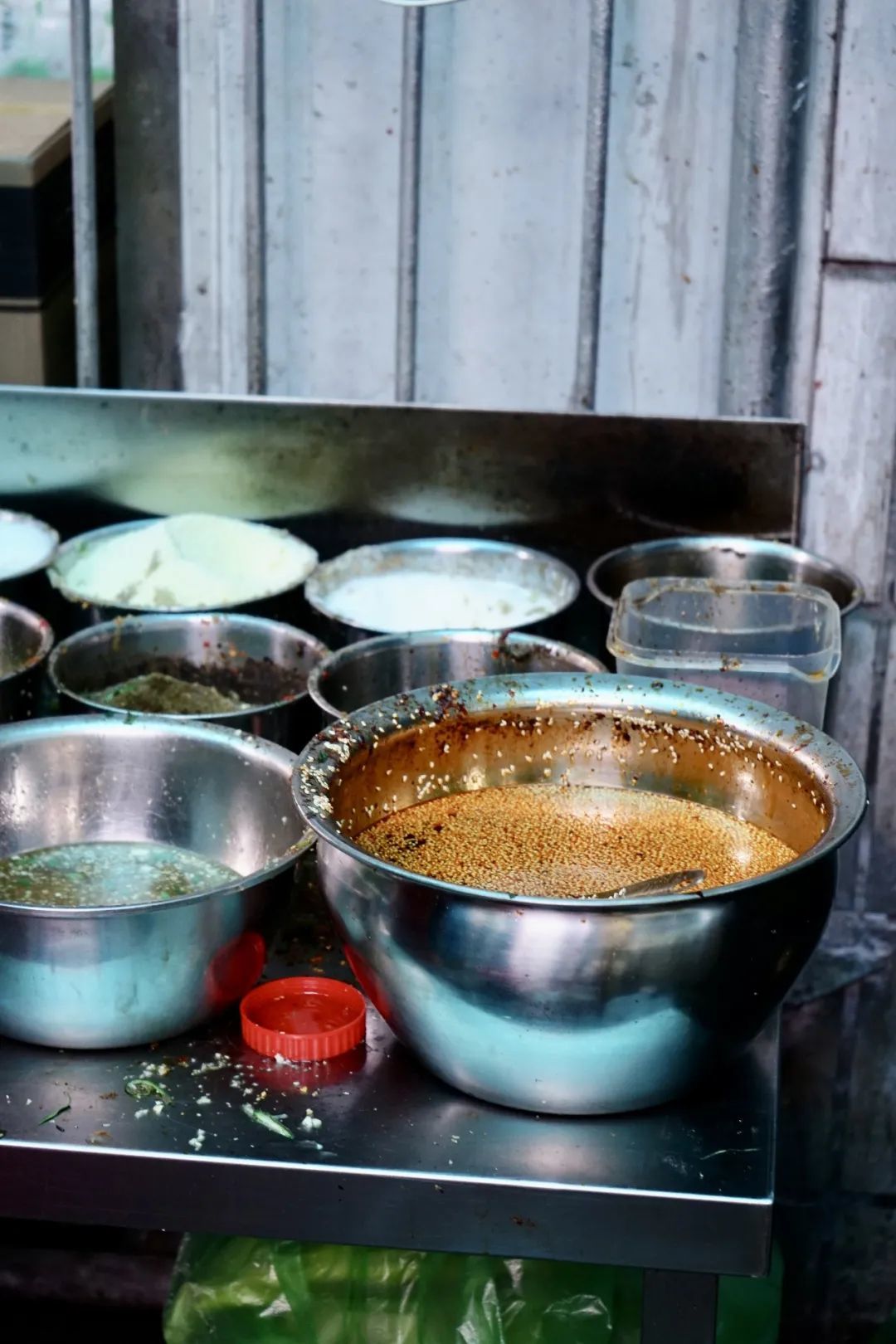 一个瓶子往瓜瓢尖叫一下,然后撒上红的白的黄的调料,筷子与不锈钢摩擦的声音,凉面的颜色逐渐变成棕色带一点红油。