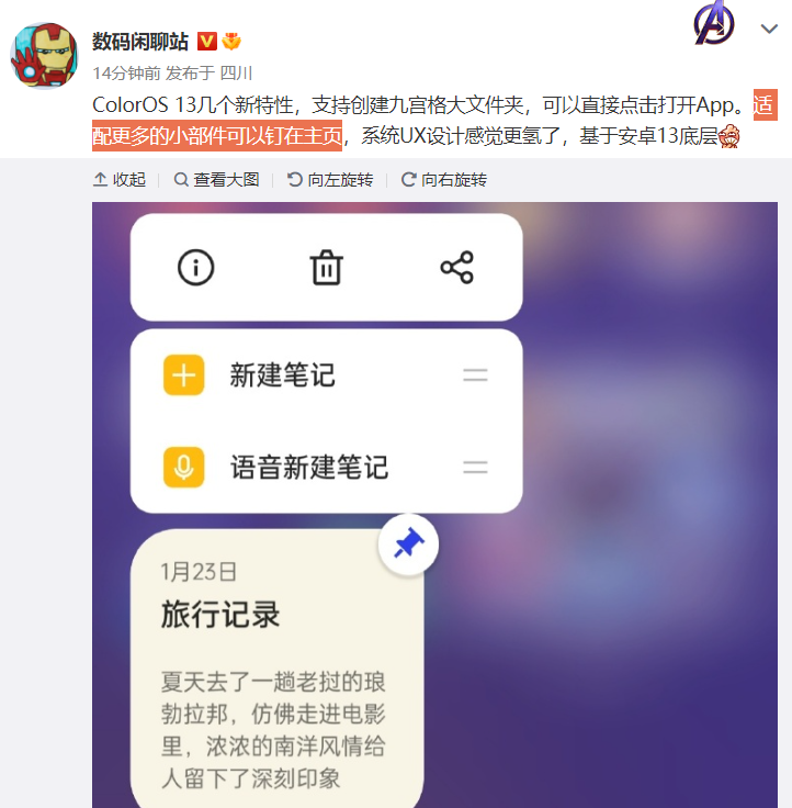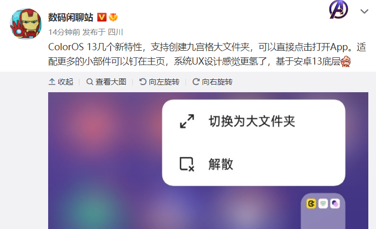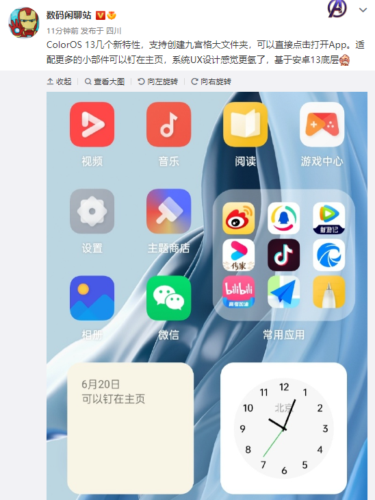 据爆料截图,ColorOS 13 支持创建九宫格大文件夹,可以直接点击打开 App。此外,ColorOS 13 适配更多的小部件,可以钉在主页。