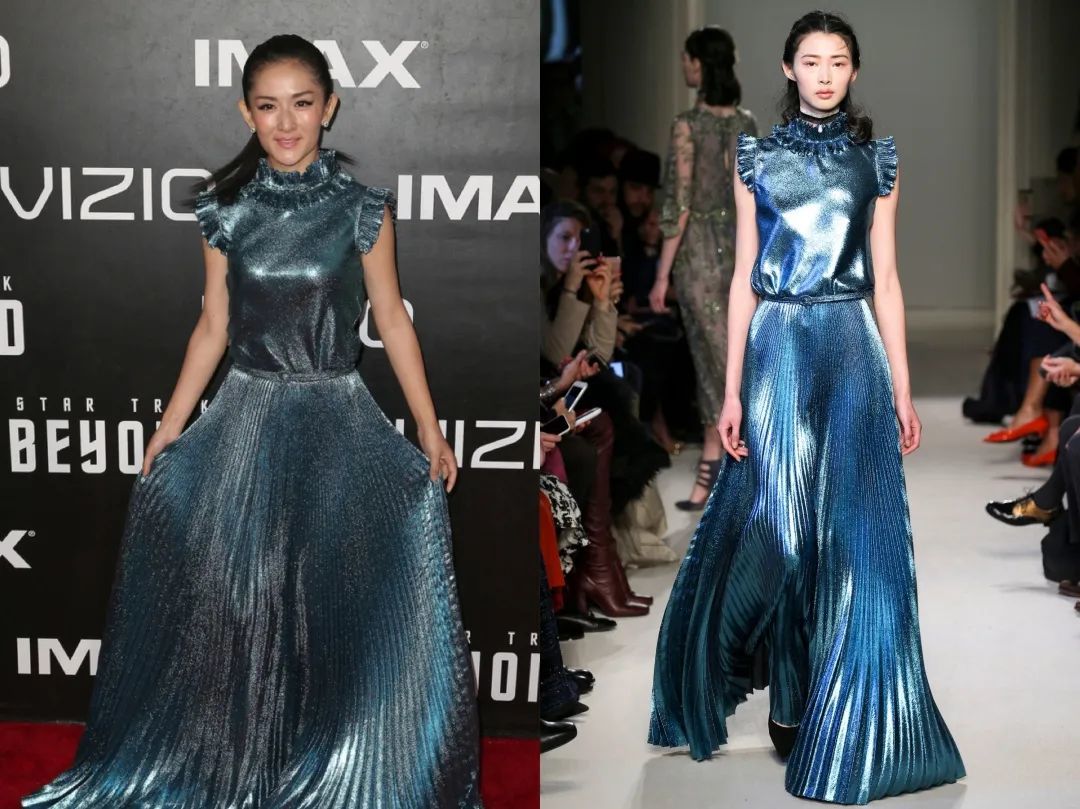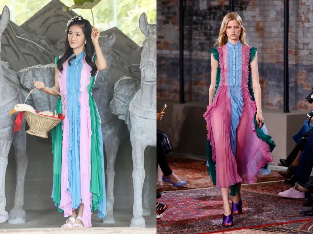 她不是简单的照搬秀场look,还会加些自己的小设计,像这套纱裙就DIY加了根腰带,腰线一下子就出来了,效果比模特穿的还好看。