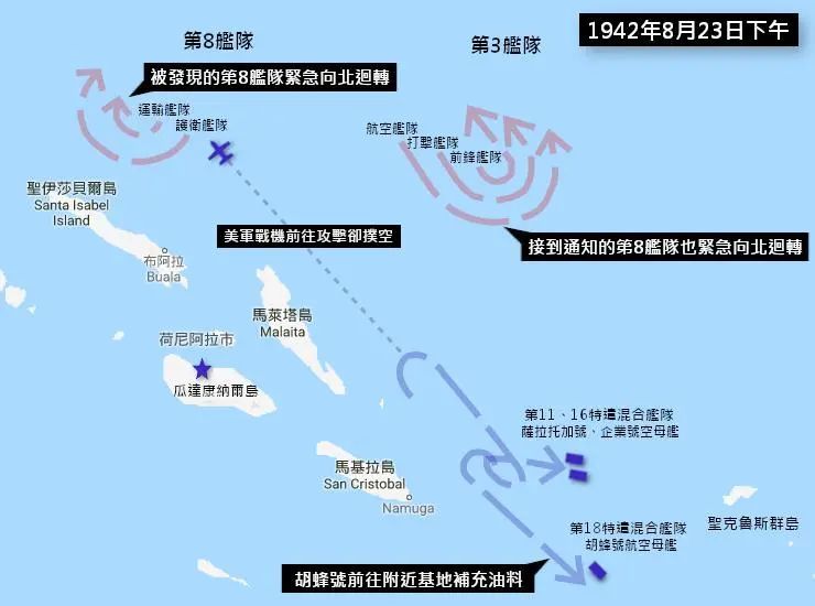 然而,爱加油的弗莱彻在23日下令“黄蜂”号编队回到南面900多公里外的埃法特岛去加油,从而让自己手上的兵力减少了三分之一。此时,日美双方的航空母舰兵力几近相等,舰载机数量也非常接近。