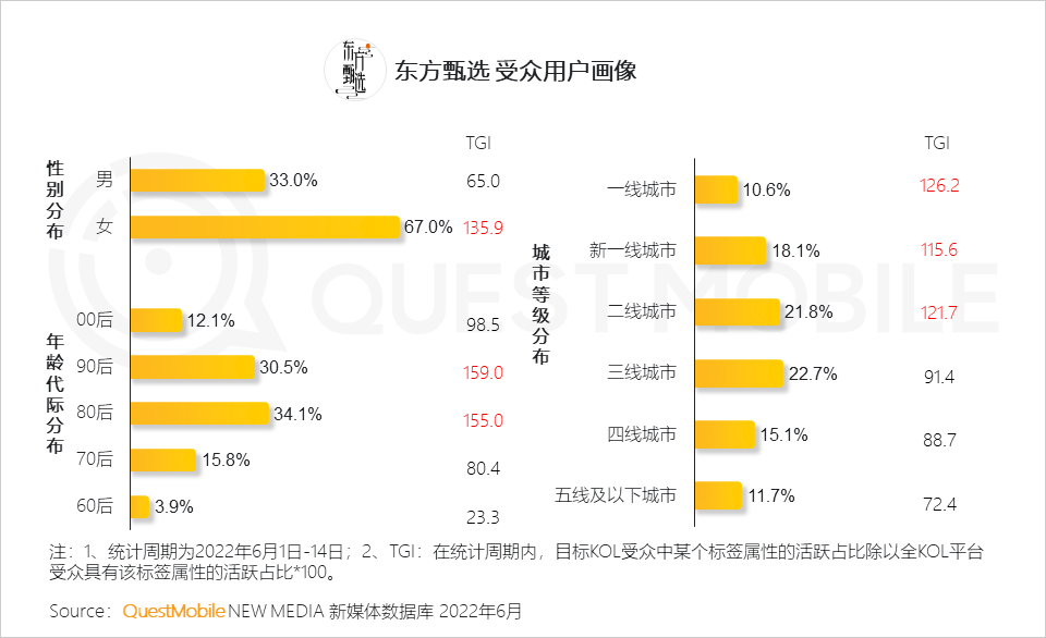 2、东方甄选受众女性占比接近70%,80、90后及一二线经济较发达城市用户偏好明显