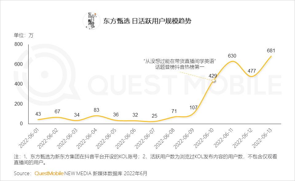 1、东方甄选日活跃用户规模近期提升显著:“上课” +“卖货”形式吸引用户关注,直播间的火热带动了东方甄选KOL用户热度,活跃用户数峰值达681万,较前一周均值提升近14倍