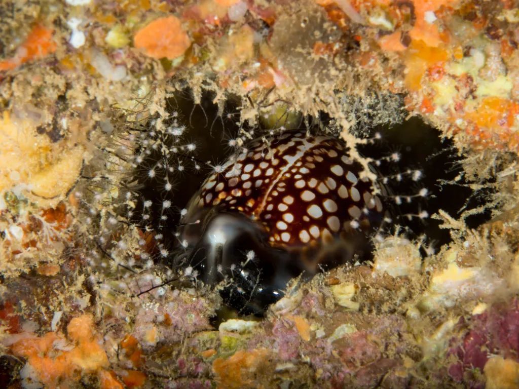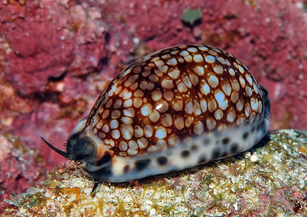 胎记绶贝栖息在潮间带至浅海水深10~20m的岩礁或珊瑚礁质海底。