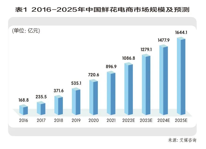 消费渠道。线上鲜花市场方面,近两年,网购已经成为鲜花消费的重要渠道。艾媒咨询数据显示,2016年到2021年鲜花电商市场规模逐年扩大,2016年鲜花电商市场总销售额仅168.8亿元,到2019年已突破500亿大关,预计2022年将首次突破千亿大关,2025年将超过1600亿(见表1)。在我国零售行业中,鲜花赛道的发展增速高于全品类均值,鲜花外卖电商的发展增速远高于行业均值,并且呈现倍速级增长。2021年,“饿了么”鲜花外卖的业务规模同比翻倍增长,动销商户数、单日订单等数据指标在大促节日连续突破历史峰值。