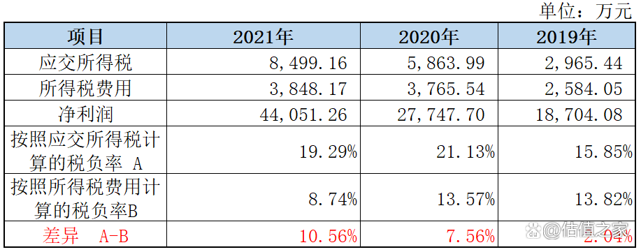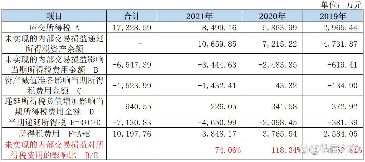 深入来看,会计上所得税费用由当期所得税和递延所得税构成,上表中发行人所得税费用税负较当期所得税税负进一步降低,那么显然上表税负的差异肯定是递延所得税造成,而影响所得税费用税负率降低的便只能是递延所得税资产(借:递延所得税资产 贷:所得税费用);前面我们提到过,因为税会差异会在基准日产生暂时性的抵扣差异进而形成递延所得税资产,而招股书披露信息显示发行人最大的递延所得税资产便是未实现的内部交易损益,那么在此估值之家推演了一下报告期内所得税费用的由来,详见下表: