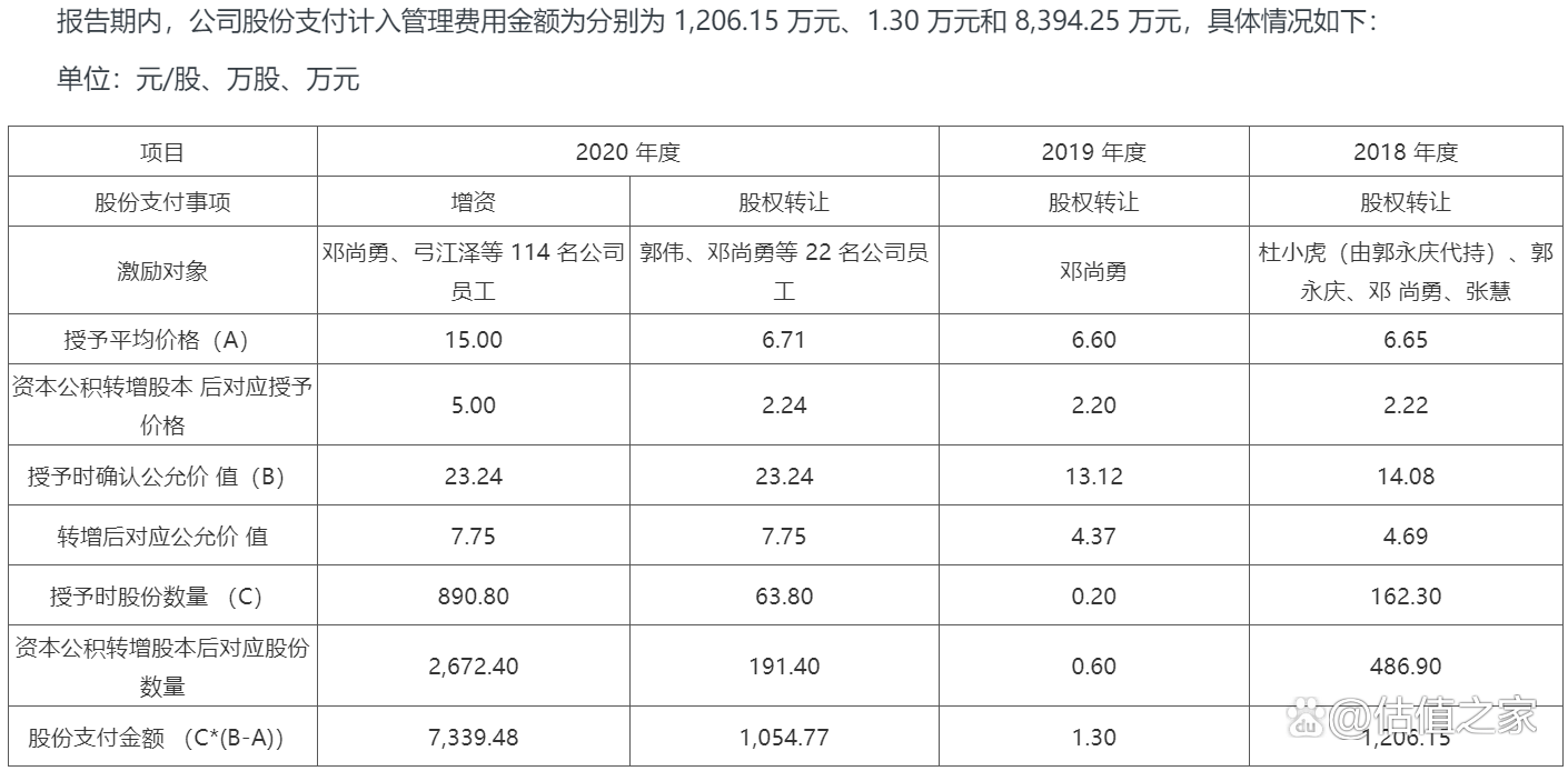 由表可知,发行人2018年、2019年、2020年授予的股份公允价值分别为14.08元/股、13.12元/股、23.24元/股,发行人对2019年至2020年股份授予公允价值采用估值技术确定,2020年公允价值参照同行业上市公司并购市盈率8.42 倍水平确定,2018 年及 2019 年公允价值按照 8.00 倍市盈率确定;与此同时可比公司莱茵生物在2020年12月31日动态PE为55.33倍、晨光生物在2020年12月31日动态PE为38.07倍,平均PE46.7倍,发行人授予的股份PE仅为8.42倍,估值悬殊太大,虽然说发行人为非上市公司正常来说会小于上市公司PE,但8.42倍的PE可能太过于低估了(足足低于平均PE 5.55倍)。