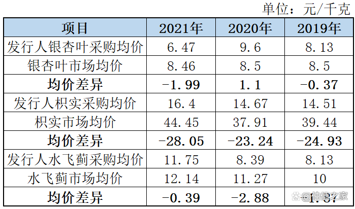 据招股书,发行人报告期内原材料主要为银杏叶、枳实、莽草、水飞蓟、红景天、槐米、虎杖提取物七类,我们随机抽取三类原材料价格与市场价格进行了比对,均低于市场均价,尤其是枳实均价显著低于市场价,详见下表: