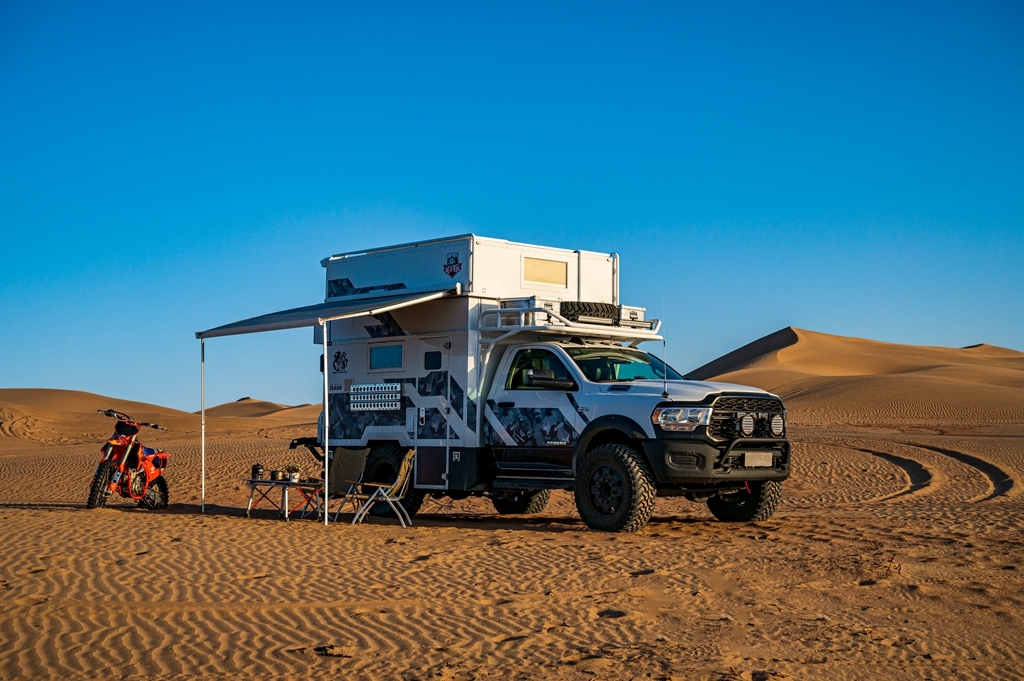 特别大!但又不失机动灵活,不论是底盘还是空间,旅美速腾公羊5500地球流浪者四驱越野房车将“大”的属性表现的淋漓尽致。据悉旅美速腾公羊5500地球流浪者四驱越野房车采用的美国原装进口道奇公羊5500底盘,是6米以内美式大皮卡底盘中相对最大的一款,以这样的底盘打造房车,势必注定了车辆空间更大,布局和设计的灵活度也更高。而事实也是如此,进入旅美速腾公羊5500地球流浪者四驱越野房车内部,会发现它有两张大床,分别是对坐沙发变成的大床,以及一张升降吊床,两张床可以让房车旅行休息睡眠空间更充裕更舒适。另外,车内厨房、卫浴间、独立衣柜等空间配置也是相当齐全,想做饭,想洗漱淋浴,想存放衣物,这些生活需求都能实现。