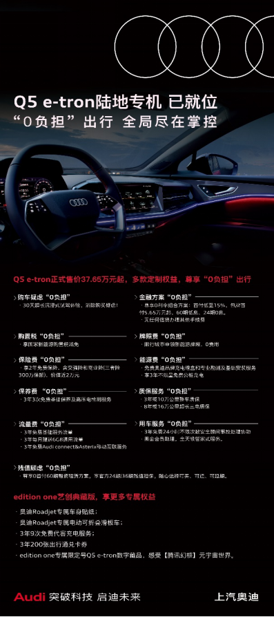 总的来说,无论是在续航里程、智能配置、时尚造型,还是宽适空间方面,奥迪Q5 e-tron都有着出众的表现。如今,各地也纷纷推出补助政策鼓励新能源汽车的购买与使用,“0税0牌0油”让奥迪Q5 e-tron车主大大节省了前期投入的成本。同时,基于“用户为先”的品牌理念上汽奥迪带来了11大“0负担”权益,覆盖从购车开始到养修、充电、保险、流量、出行等车主用车全生命周期的全场景需求。购买奥迪Q5 e-tron车主将直接获得“一价全包”的尊享权益,无需额外支付费用。