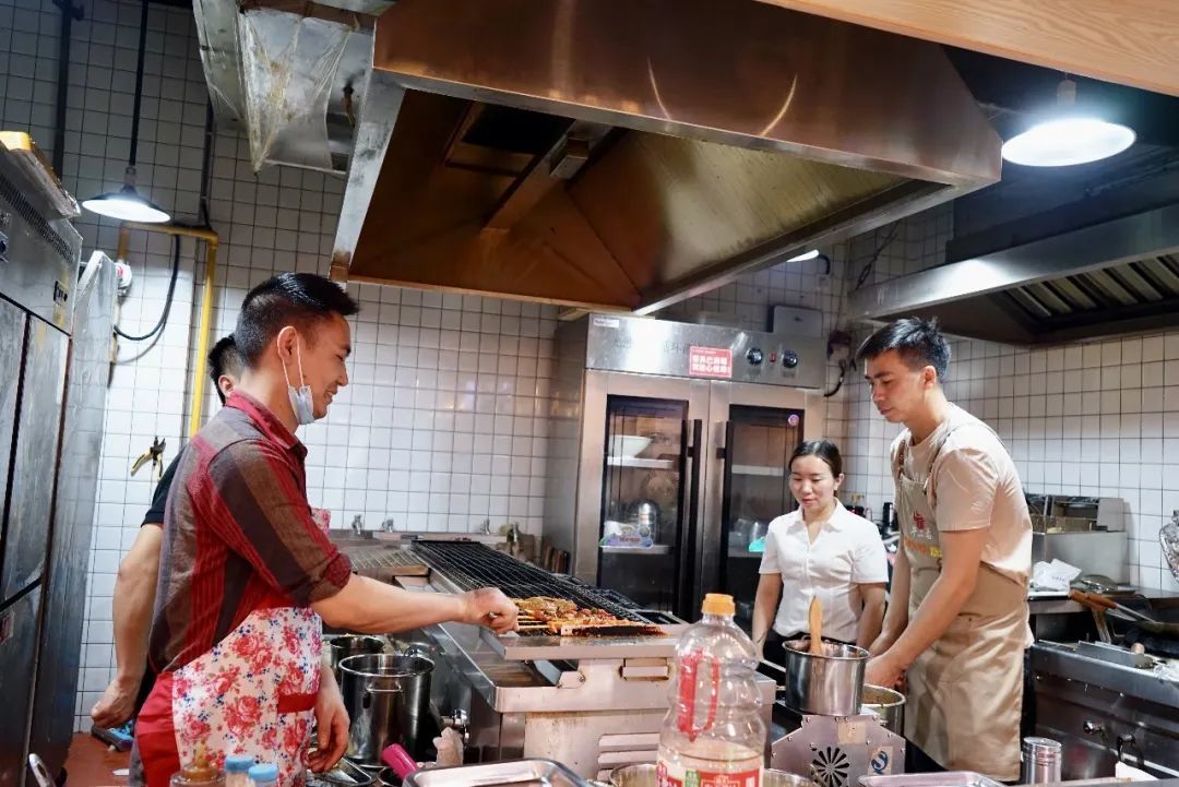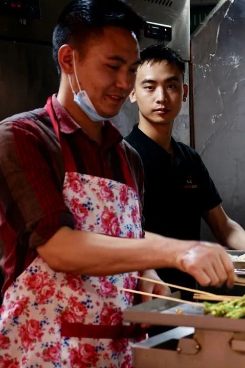 领头的系花围裙,三四个昭通小哥齐聚烤架,相对站立,数手连烤。调料桶中,折耳根小米辣溢出的奇香奇辣,令人口舌生津。