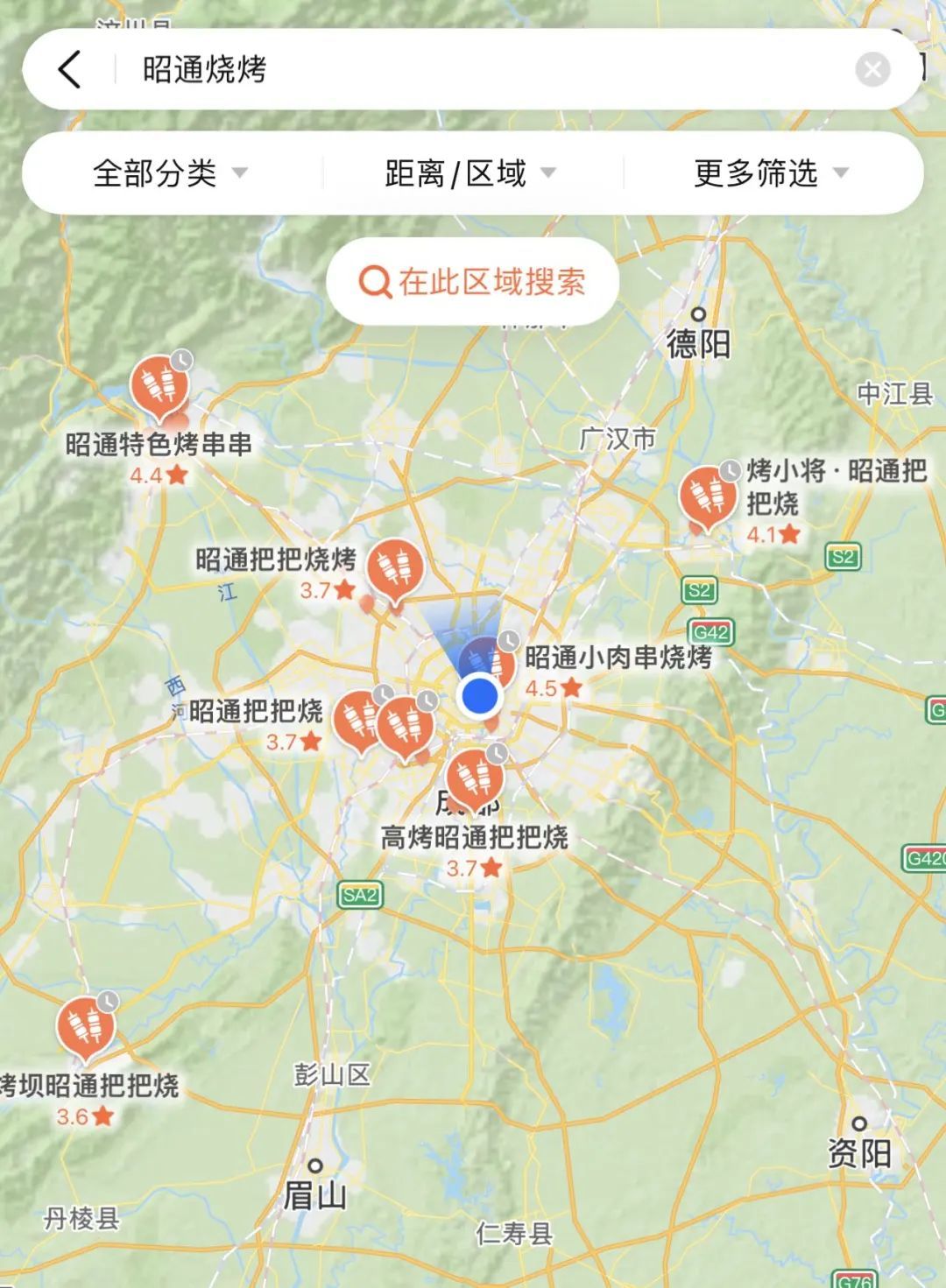 昭通烧烤在成都也只是这两年才慢慢做起来。大成都范围内,不到50家,和超过1600家的把把烧完全不能比。具体到市中心的数量,昭通烧烤就少得更可怜。