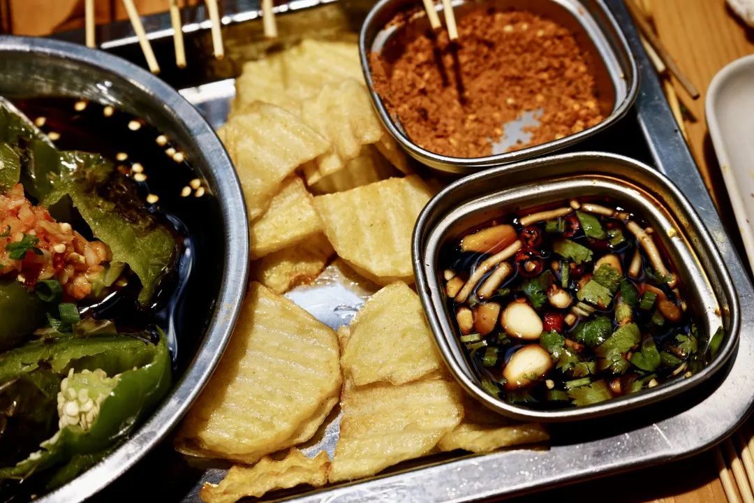 点餐不用菜单,直接端盘子去冰箱里拿,和摊摊上的烧烤差不多。老板拿小本子给每一桌记账。小肉串,“两把”。洋芋,“肯定也要”。昭通的大洋芋,很有名。
