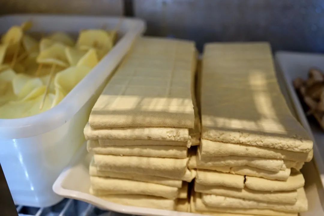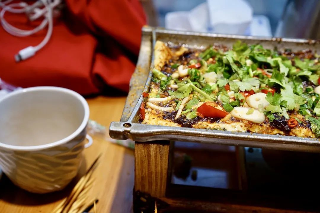 豆腐被油水封住,还在沸腾。分量扎实,滑嫩多汁。没有豆腥味,咬两口,也有点“糯叽叽”的口感。