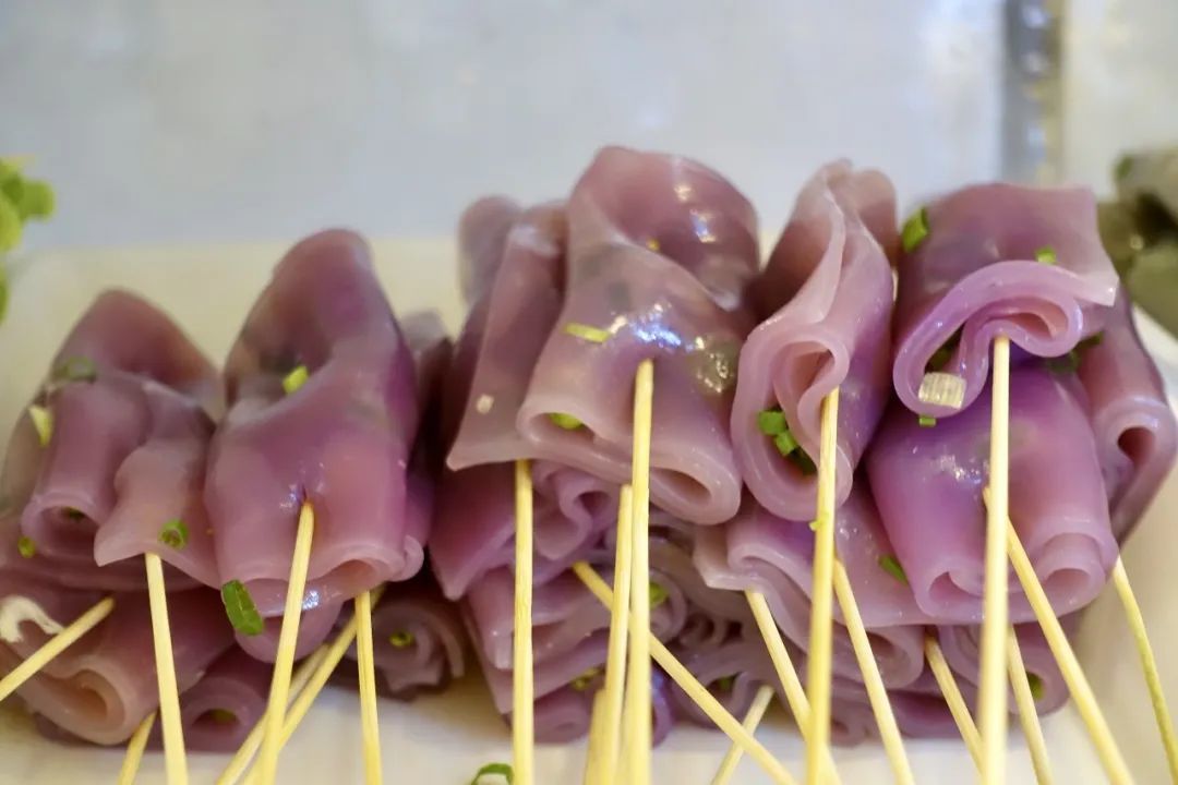 苕皮明明拿过了,“那个紫粉色的,又是什么”?问就是想吃,拿。长条的爆浆豆腐,大块水润,孔隙在呼吸,生的都诱人。“拿了吗”?“拿了”。