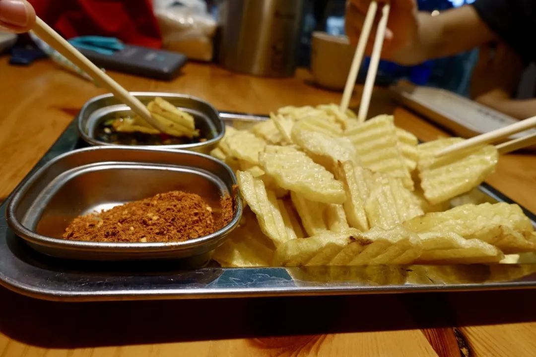 色泽澄黄的炸洋芋,肉眼可见的粉糯,吃起来更瓷实细腻。可蘸干碟,也可以蘸湿碟子,标配两种蘸水。