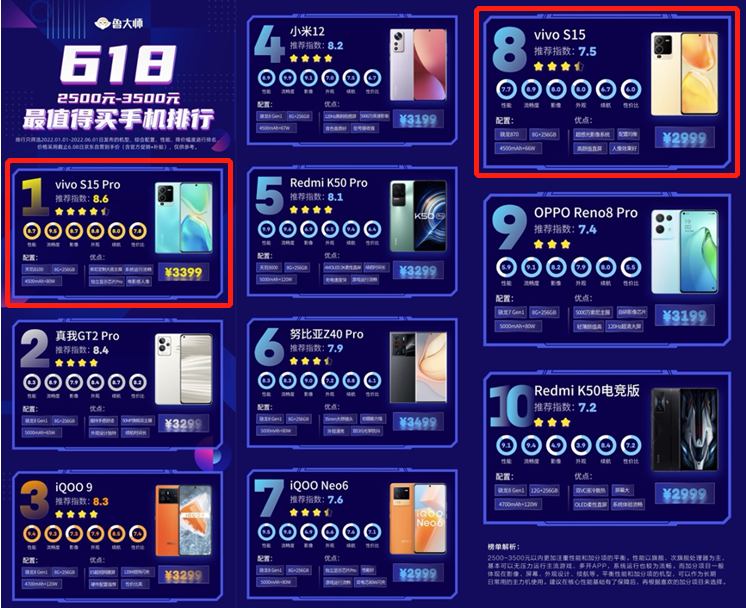 综上可以看到,轻薄机身、高颜值,以及强大的人像拍摄能力,vivo S15 Pro还有天玑8100和独显芯片Pro的性能加持,达到了媲美游戏手机的水平,如此优秀的综合素质,让它也成为鲁大师2500-3500元档位值得购买手机排行榜的第一名,全面的性能表现,普通消费者闭眼买入即可!