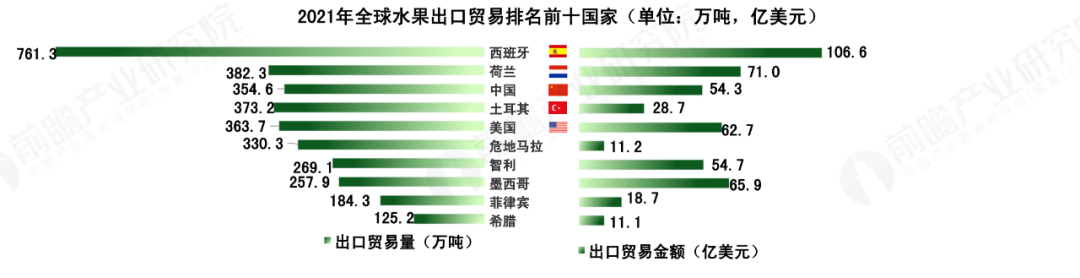 据前瞻产业研究院的报告,2021年中国水果的出口额排名世界第三,共出口354.6万吨,价值为54.3亿美元。