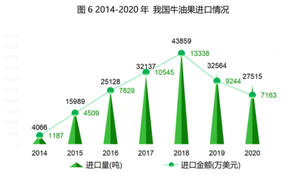 这是因为我国的牛油果在2018年开始实现出口。据云果数据,2018年牛油果出口额仅为1800美元,到2020年,牛油果出口额增长至8.36万美元。出口没问题了,内销自然也是能够满足。而且国产牛油果在供应链上比进口牛油果有着更短的运输时间,新鲜度、成熟度都更加有保证。