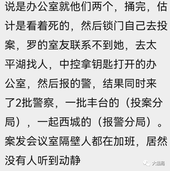 说是办公室就他们两个,捅完,估计是看着死的,然后锁门自己去投案;罗的室友联系不到她,去太平湖找人,中控拿钥匙打开的办公室,然后报的警;结果同时来了2批警察,一批丰台的(投案分局),一起西城的(报警分局)。案发会议室隔壁人都在加班,居然没有人听到动静