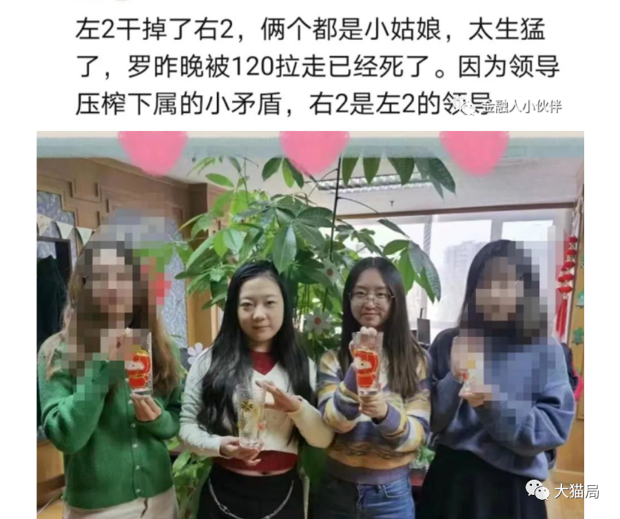 被疯狂转发的照片里,另外两个年轻姑娘仅仅是96、97年新入职的小姑娘啊,你连码都不打就这么大规模吃瓜,考虑过对他们造成的影响吗?如果他们是你的女儿呢?深夜时分,希望你在某种情绪得到释放的同时,心底能有一丝丝的人性召唤大好的人生,灿烂的未来,就因为认真生活、认真工作,有那么多未竟的人生理想想去实现,却被人残忍的夺走了生命,需要反思吗?需要,如果再来一次,我会反思要全力劝你远离垃圾人,但是这样,每一个人都当一个尸位素餐的人,这个世界就会好吗?多希望人世当如红绿灯,红灯行绿灯停;善有终恶有报。但总有闯红灯的人,却让绿灯行的人反思你怎么不看着点呢,没道理啊,朋友们没道理。