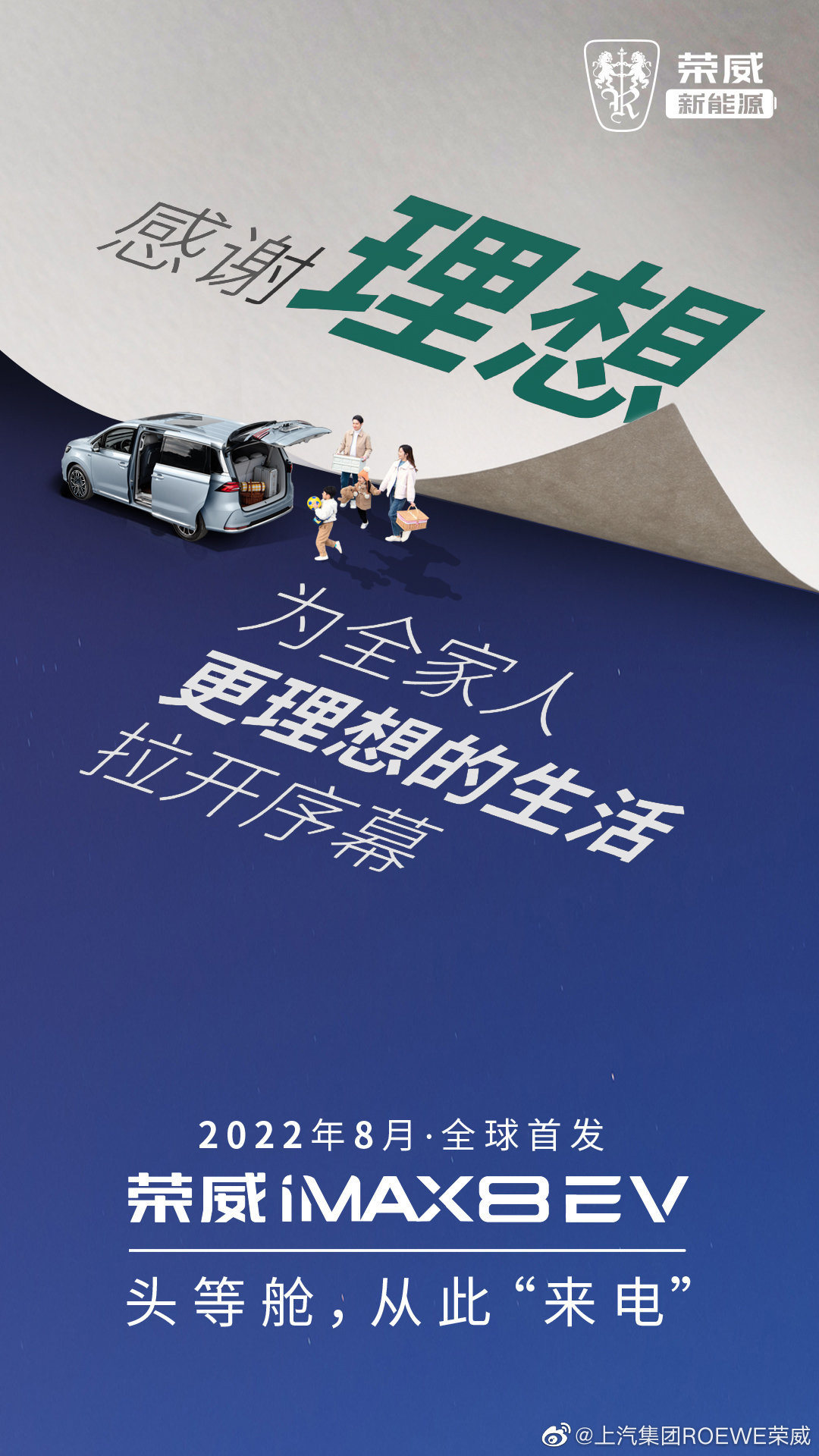 IT之家 6 月 22 日消息,上汽荣威宣布旗下纯电动中大型 MPV—— 荣威新能源 iMAX8 EV 将在八月正式上市,并表示“感谢理想”,看起来是要跟理想刚刚发布的 L9 进行竞争。