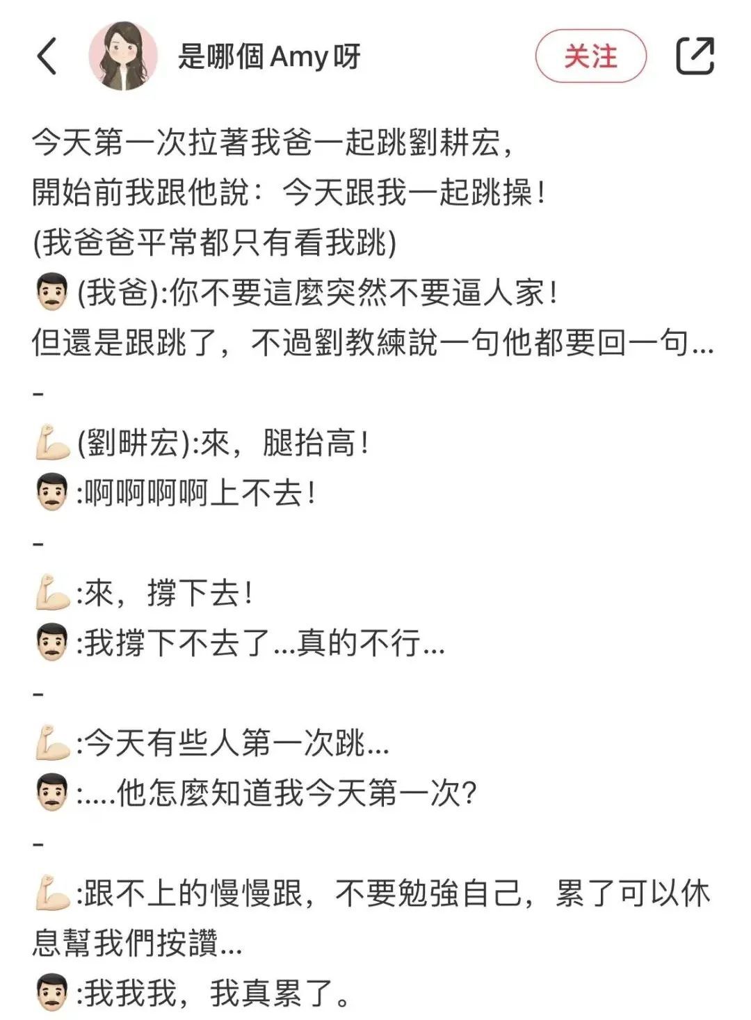 年过半百的刘畊宏男孩,手脚不停,嘴巴也不停。他们一边努力跟上动作,一边叭叭叭:“我真的撑不下去了...我真的累了...”