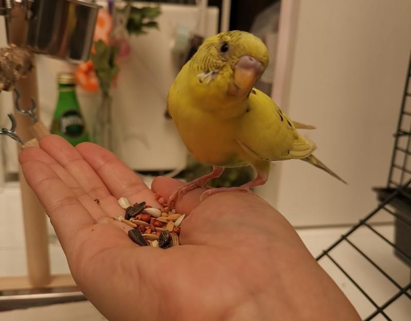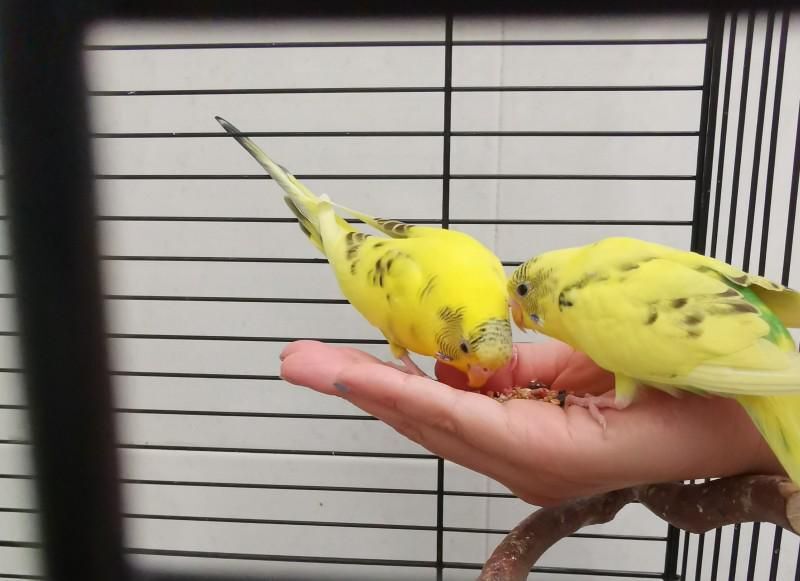 当鸟儿们不抗拒你手时,可以进入上手喂食的阶段了。将鸟粮放入掌心,慢慢把手伸进笼子,等待他们跳到手上来。一般来说,鸟是直肠子动物,经不起食物诱惑,加上之前已经适应你的手了,不出五分钟,便会上手吃粮。这时,切勿手不要乱动,让他们吃一阵子,然后可以轻轻用手指触碰鸟腹。连着几天,他们很快就会养成看到你的手伸过去,就跳上掌心的习惯。之后你可以把手慢慢移出笼外,让他们适应下笼子