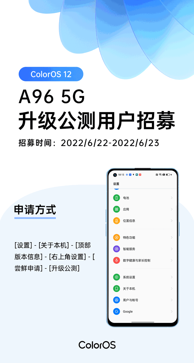接下来为大家介绍一下OPPO A96 ColorOS 12的公测计划,OPPO A96公测招募时间为:6月22日至6月23日,可以通过参与答题提高审核通过概率,预约申请后5个工作日审核,版本将在审核后3个工作日内进行推送。需要注意的是,升级之前请确保您的手机版本已经升级到基础版本 A.08 (版本号查看方法:设置 > 关于本机 > 版本信息 > 版本号);然后请在手机上点击“设置 > 关于本机> 顶部版本信息(“手机名称”上方) > 右上角设置按钮 > 尝鲜申请 >升级公测”,然后根据提示进行申请。升级公测版本使用中遇到任何问题可在反馈工具箱APP中(也可以通过拨号键盘输入*#800# 进入APP)进行反馈。