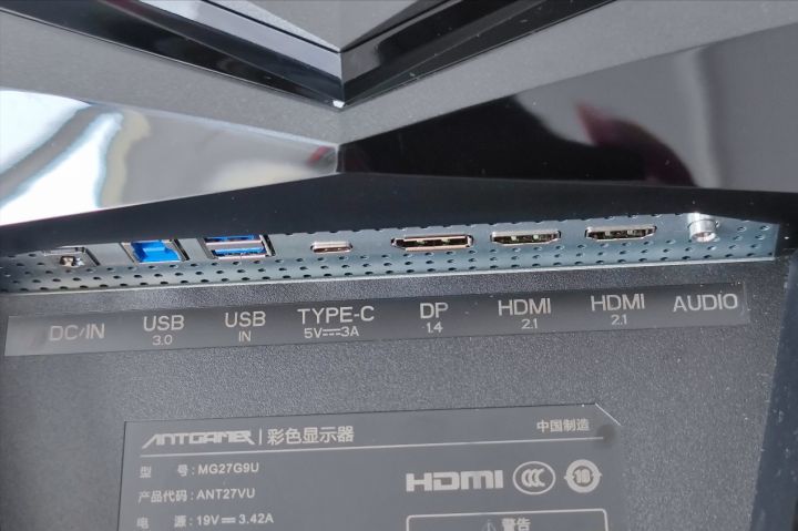 接口方面也非常丰富,一个电源输入口、2个HDMI2.1接口、1个DP1.4接口以及2个USB接口,另外它还有一个3.5mm音频输出接口,以及一个C口,这个C口可以输出15W的功率,可以通过C-C的线材给手机、耳机等常用设备充电,还是非常方便的。
