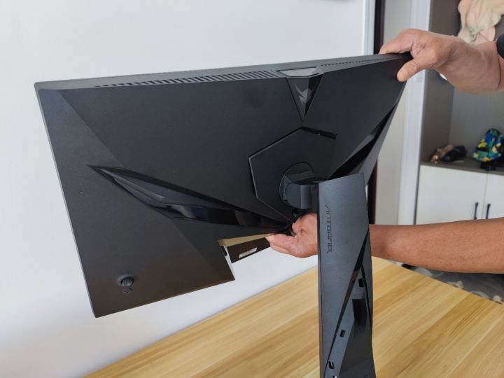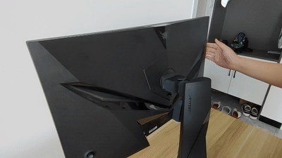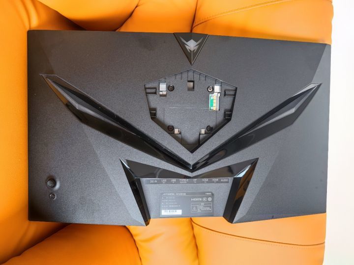 显示器的背部和支架均采用了粗磨砂质感的处理,这样做的好处就是不容易沾染指纹,而且整个显示器的背部采用了类似蚂蚁触角的造型,还没有安装就已经能感受到它的“战斗感”了。