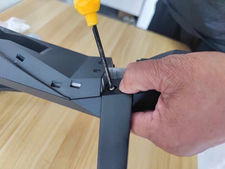 安装过程也是比较简单的,只需要用四颗螺钉将脚托和支架固定,然后将支架和显示器的接口卡住就完成安装了。