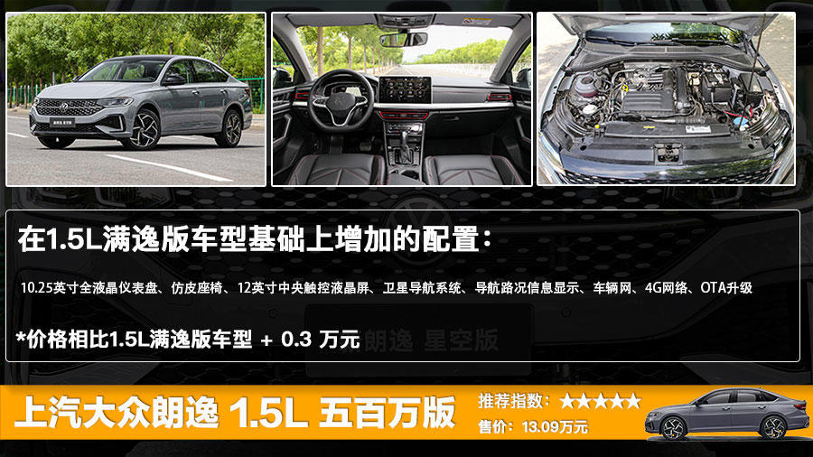 1.5升自动五百万版比1.5升自动满逸版贵了0.3万元,这0.3万元换来的配置有10.25英寸全液晶仪表盘、仿皮座椅、12英寸中央触控液晶屏、卫星导航系统、导航路况信息显示、车辆网、4G网络、OTA升级。如果选择1.5升自然吸气发动机车型的话,那么这款车型的性价比显然是最高的。