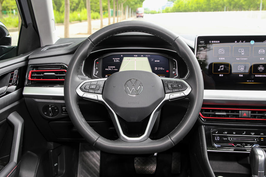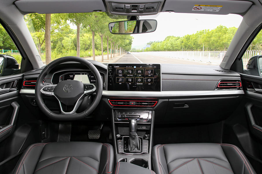 内饰设计上,新朗逸使用横向双色饰板贯穿整个仪表台,视觉上将中控台分割为上下两部分,中控屏由原来的嵌入式改为大众品牌最新的悬浮式设计,全新的家族式方向盘,空调出风口、仪表盘、门板等处,均采用炫银质感的镀铬加以修饰。酷感黑则为运动版车型独有的配色方案,采用大面积石墨黑色高级皮革面料,并在空调出风口,座椅缝线和扶手处使用红色作为点缀。