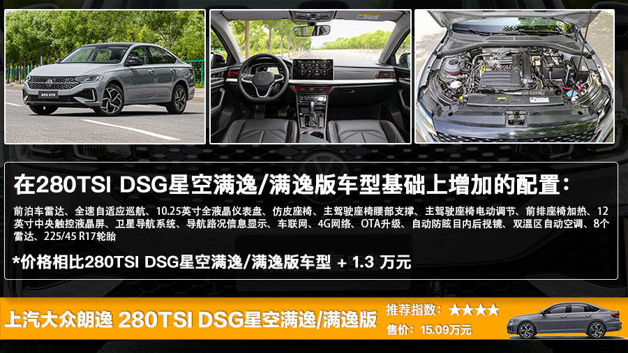 作为全系最顶配的280TSI DSG永逸版/280TSI DSG星空永逸版车型来说,它们在价格上比280TSI DSG满逸版/280TSI DSG星空满逸版贵了1.3万元,配置发那个面则增加了前泊车雷达、全速自适应巡航、10.25英寸全液晶仪表盘、仿皮座椅、主驾驶座椅腰部支撑、主驾驶座椅电动调节、前排座椅加热、12英寸中央触控液晶屏、卫星导航系统、导航路况信息显示、车联网、4G网络、OTA升级、自动防眩目内后视镜、双温区自动空调、8个雷达、225/45 R17轮胎。显然从配置上来看它要高一些,但是价格也是最高的,如果你的预算十分充足的话,那么可以考虑它。
