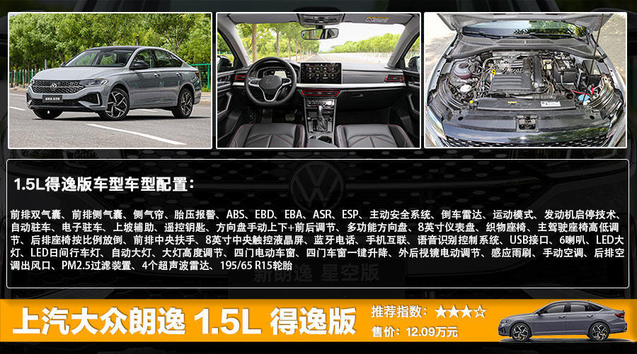 作为全系的入门级车型,售价为12.09万元的1.5升自动得逸版在配置方面配备了前排双气囊、前排侧气囊、侧气帘、胎压报警、ABS、EBD、EBA、ASR、ESP、主动安全系统、倒车雷达、运动模式、发动机启停技术、自动驻车、电子驻车、上坡辅助、遥控钥匙、方向盘手动上下+前后调节、多功能方向盘、8英寸仪表盘、织物座椅、主驾驶座椅高低调节、后排座椅按比例放倒、前排中央扶手、8英寸中央触控液晶屏、蓝牙电话、手机互联、语音识别控制系统、USB接口、6喇叭、LED大灯、LED日间行车灯、自动大灯、大灯高度调节、四门电动车窗、四门车窗一键升降、外后视镜电动调节、感应雨刷、手动空调、后排空调出风口、PM2.5过滤装置、4个超声波雷达、195/65 R15轮胎。从配置上来看,作为一款合资品牌车型,新朗逸1.5升自动得逸版这样的配置还是比较全面的,基本可以满足大家的需求。