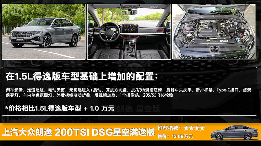 作为新增加的200TSI DSG星空满逸版,它在价格方面与1.5升自动五百万版相同,但是配置上则与1.5升自动满逸版相同,所以从性价比角度来看,如果你不太想要一款搭载自然吸气发动机的车型的话,那么它也是一个不错的选择。