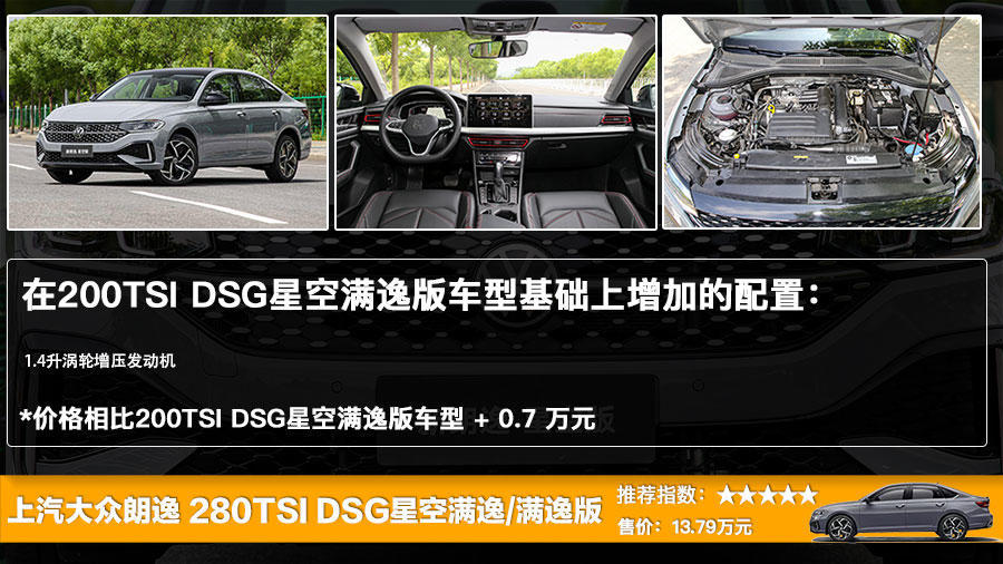 当然,如果你觉得1.2升涡轮增压发动机的动力不能满足你的话,那么你也可以选择搭载1.4升涡轮增压发动机的280TSI DSG满逸版,配置相同,它的价格比200TSI DSG满逸版贵了0.7万元。至于你想要选哪个,显然就看你是更在意动力,还是更在乎预算。对于280TSI DSG满逸版来说,它还拥有着星空前脸车型,价格相同,同为13.79万元。